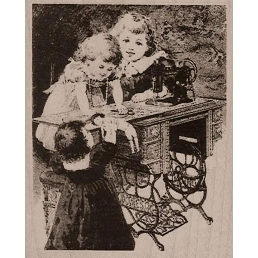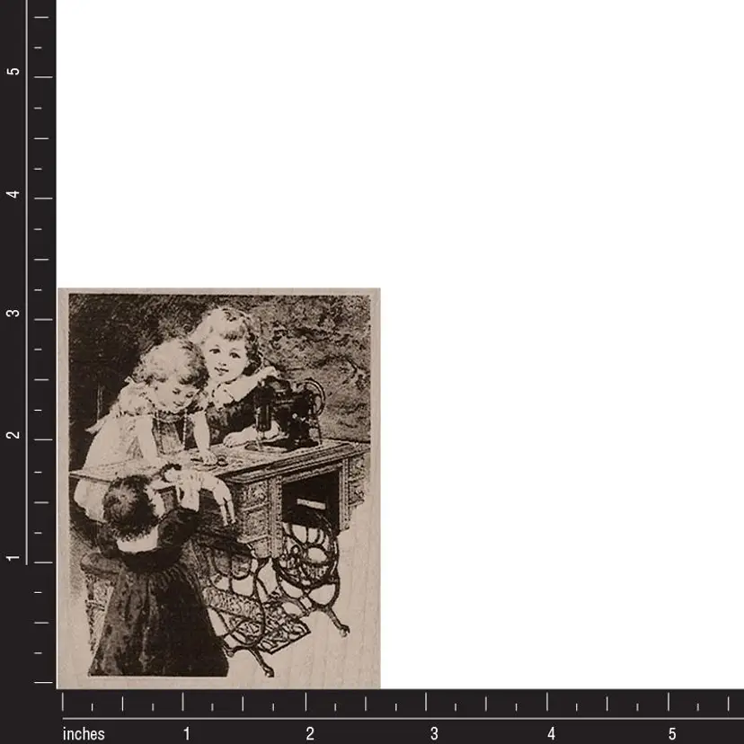 Children Sewing ATC Rubber Stamp Size: 2-3/4 x 3-1/4 inches Red rubber Handmade • Great for artist trading cards, junk journals, cardmaking, scrapbooking, mixed media and collage. 16129