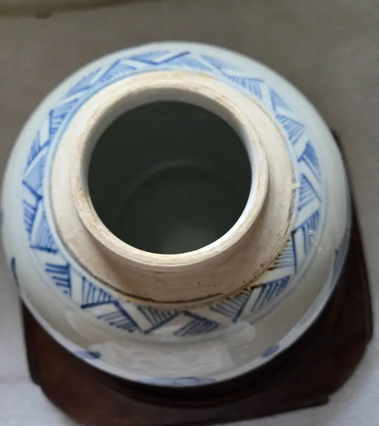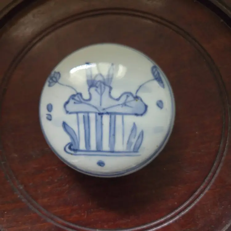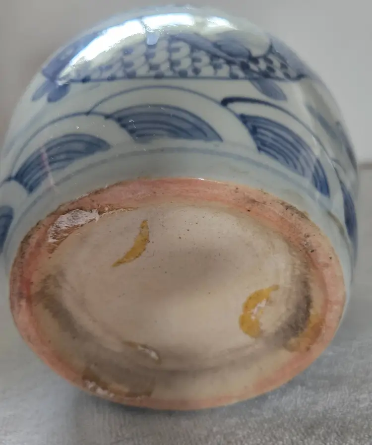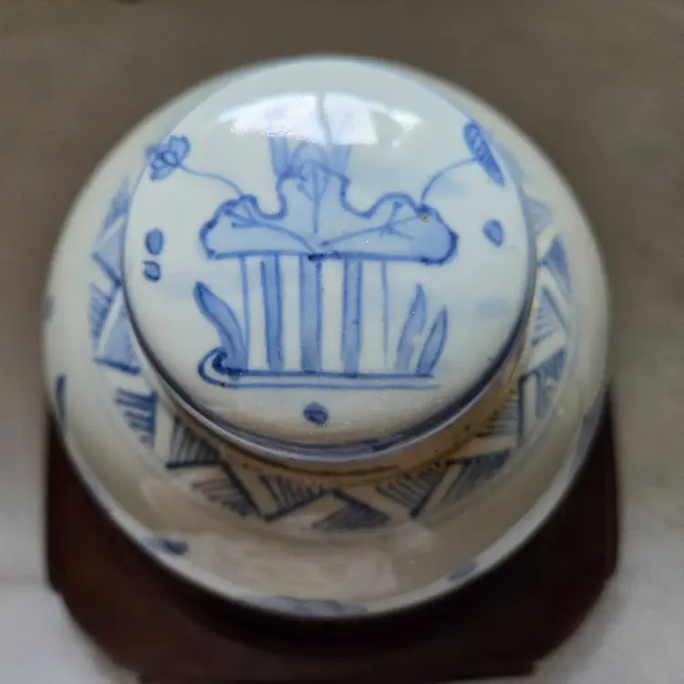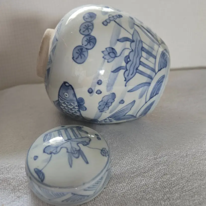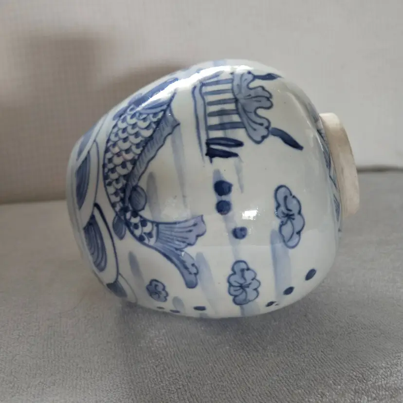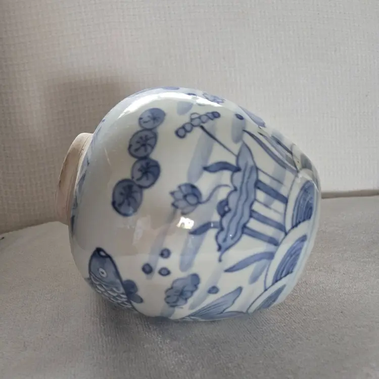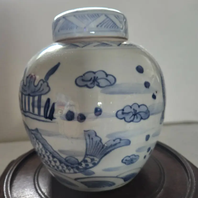 Often used as a decorative piece or as kitchen storage . This jar was hand painted in a beautiful blue and white. Measures 6.5" tall, 5" at its widest. 2" at its opening. In very good vintage condition. No chips, cracks, or craving. No markings or stickers.