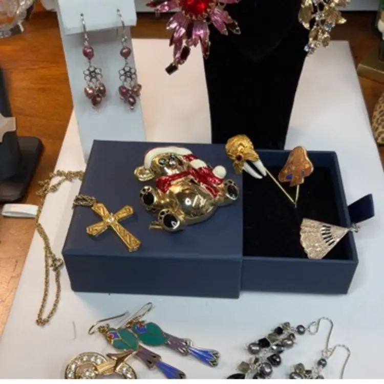 Welcome to our shop of mostly pre-owned and sometimes new jewelry treasures, trinket boxes, compacts - sometimes art and glass. Please follow us so you're in the know when we go live or add new items. Our curated beauties include a large selection of vintage pieces as well as many contemporary items. We also craft and design our own fun costume (and some fine) jewelry pieces, bookmarks, digital art and more in our small studio.
