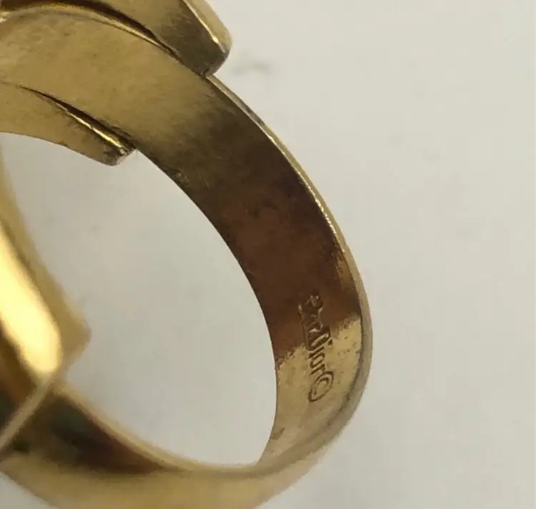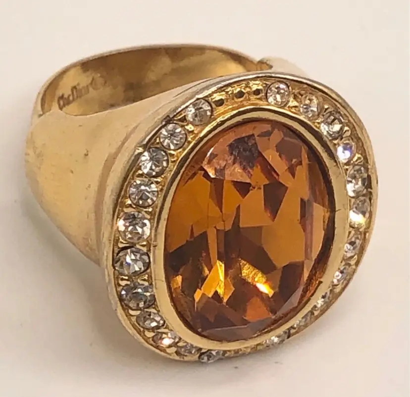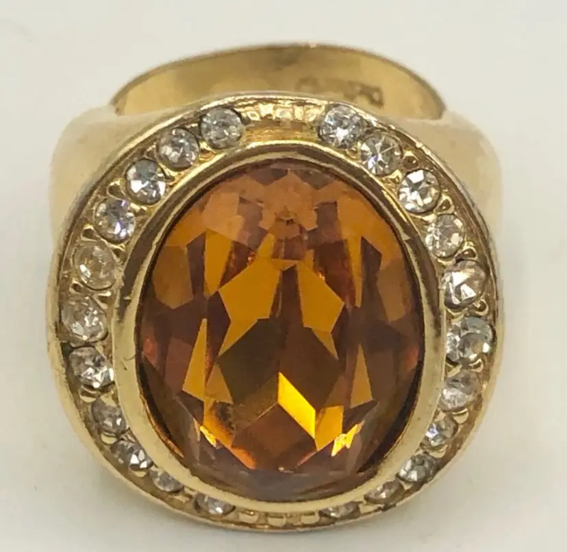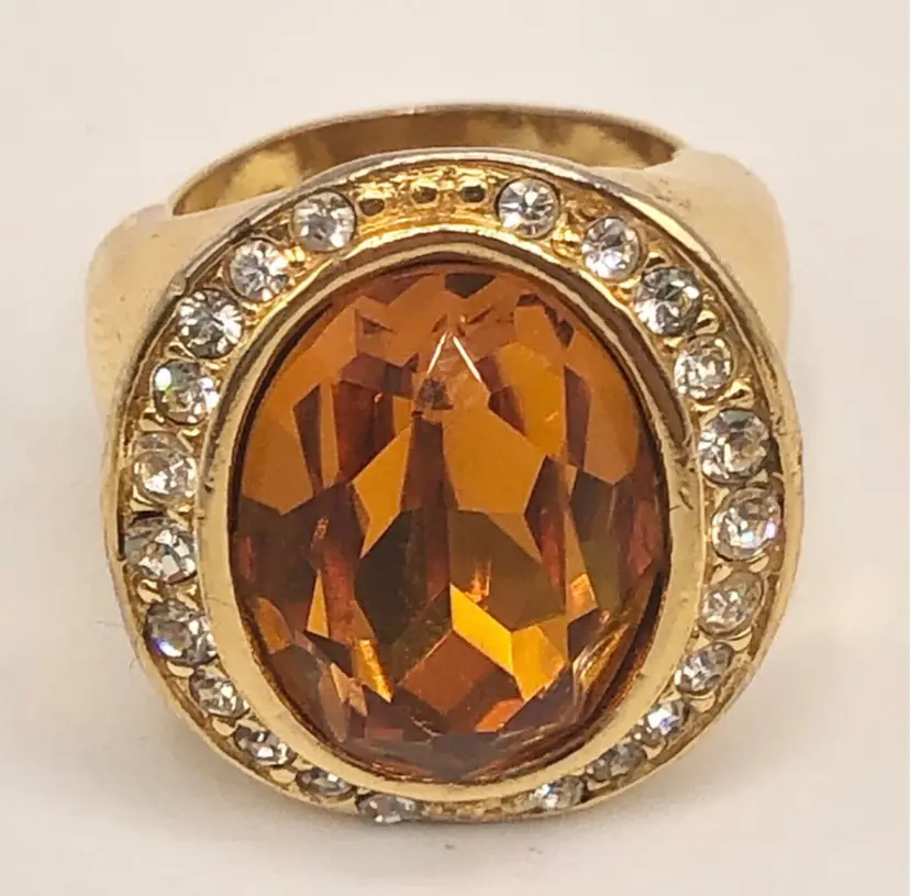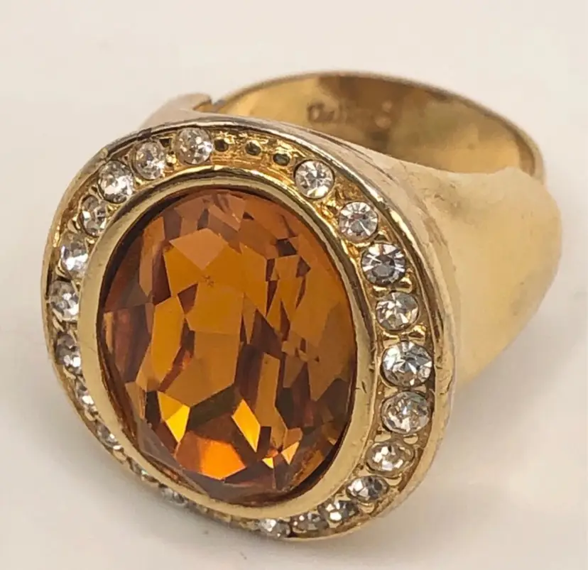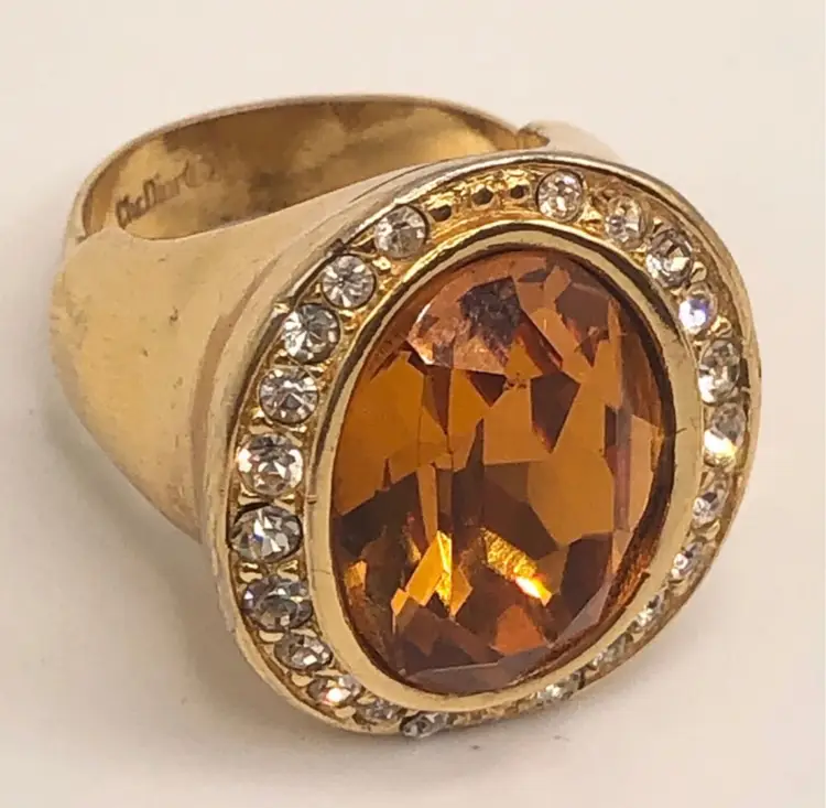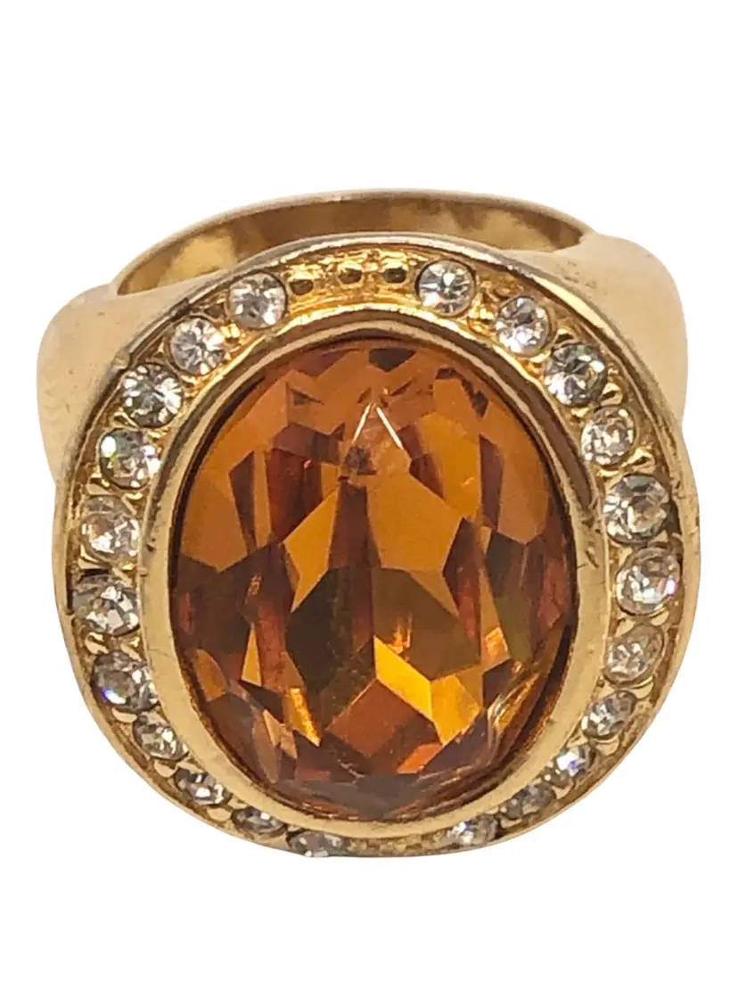 Christian Dior Glass Rhinestone Vintage Cocktail Ring. Marked Christian Dior inside band. Adjustable shank. Clear rhinestones and orange brown topaz colored faceted glass stone center. MN30GH.