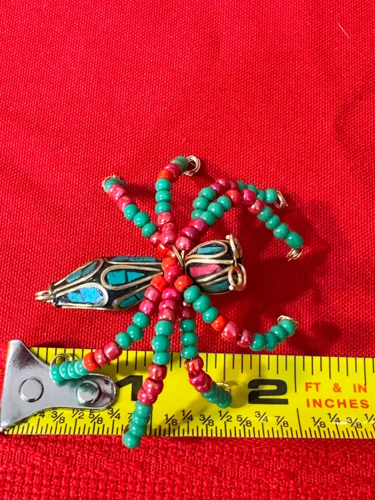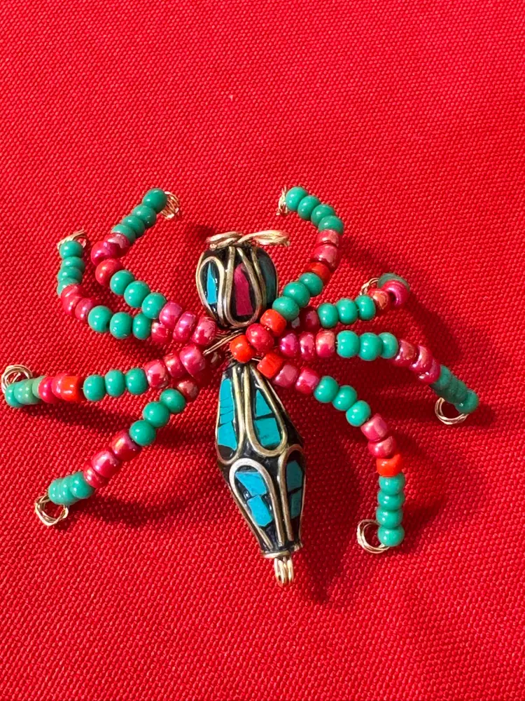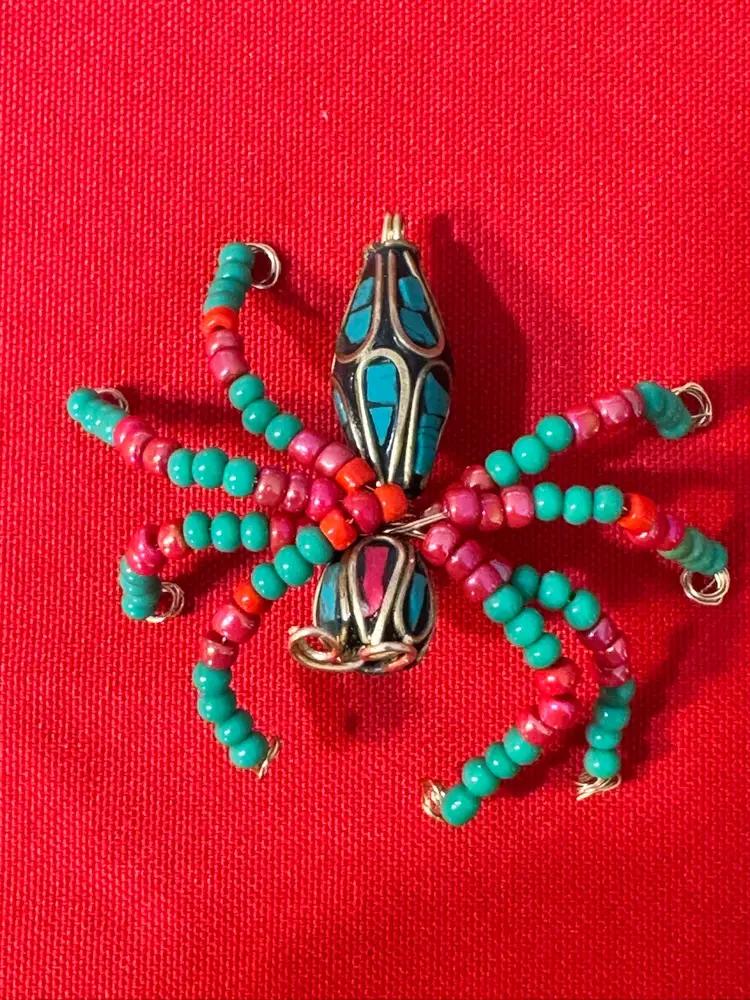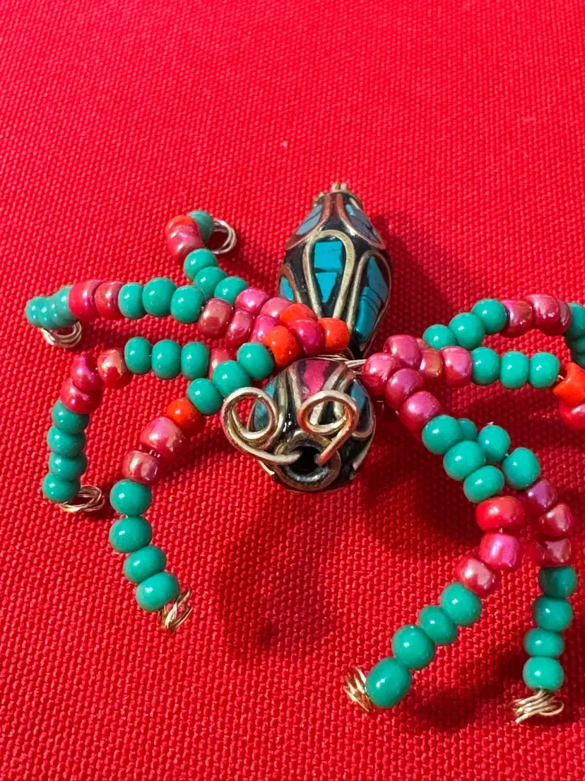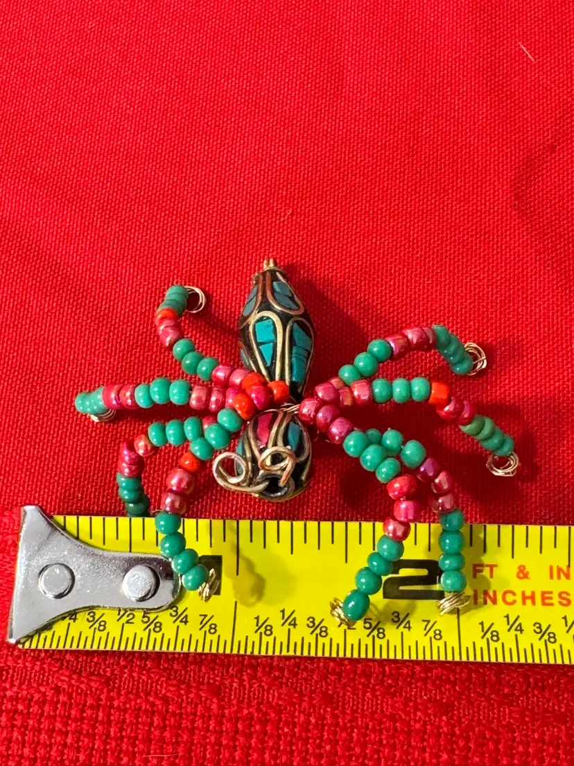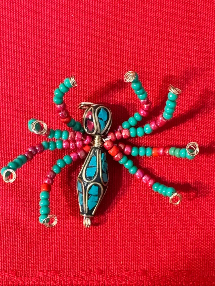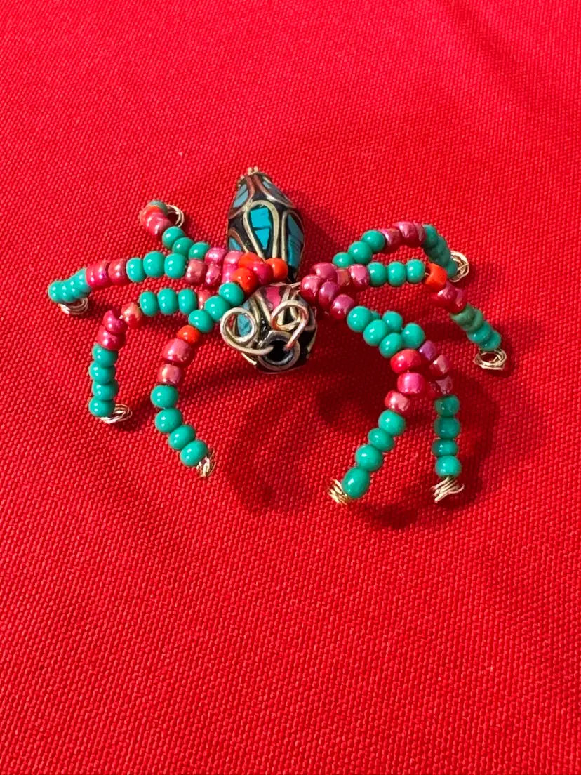 I have to say this is my favorite so far. He’s just so cute. I made this after a little jumping spider I had on my outside table. I spotted him and he spotted me. He followed me as I moved side to side. Needless to say he was out there for 4 to 7 days. Never say him again. True story. Materials used wire, free & red seed beads, beads for body are very cool with red and green with gold tone or brass outline. Measurements Apx: 2.5 in wide x 2.5” length.