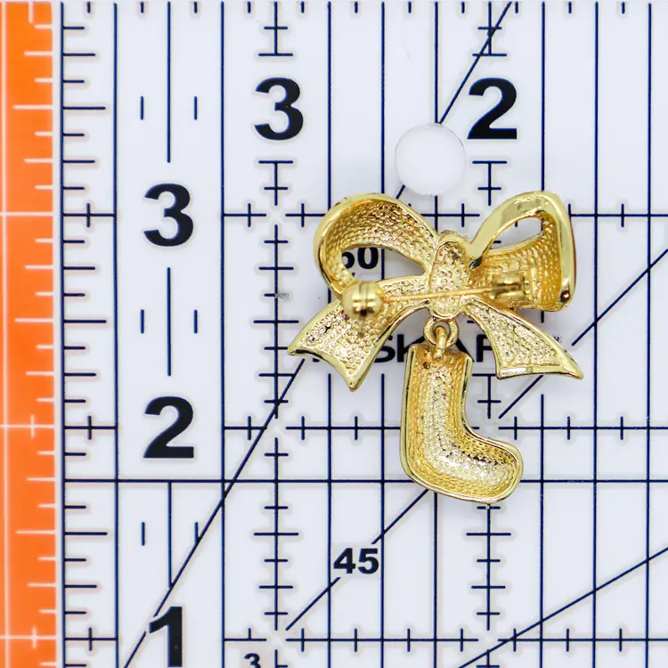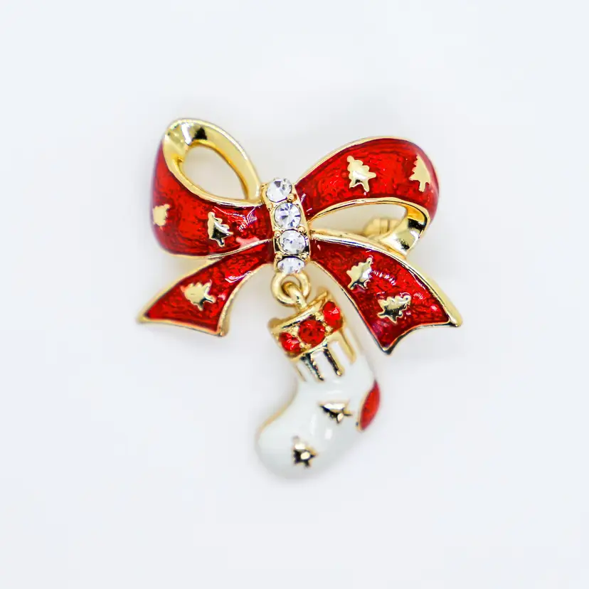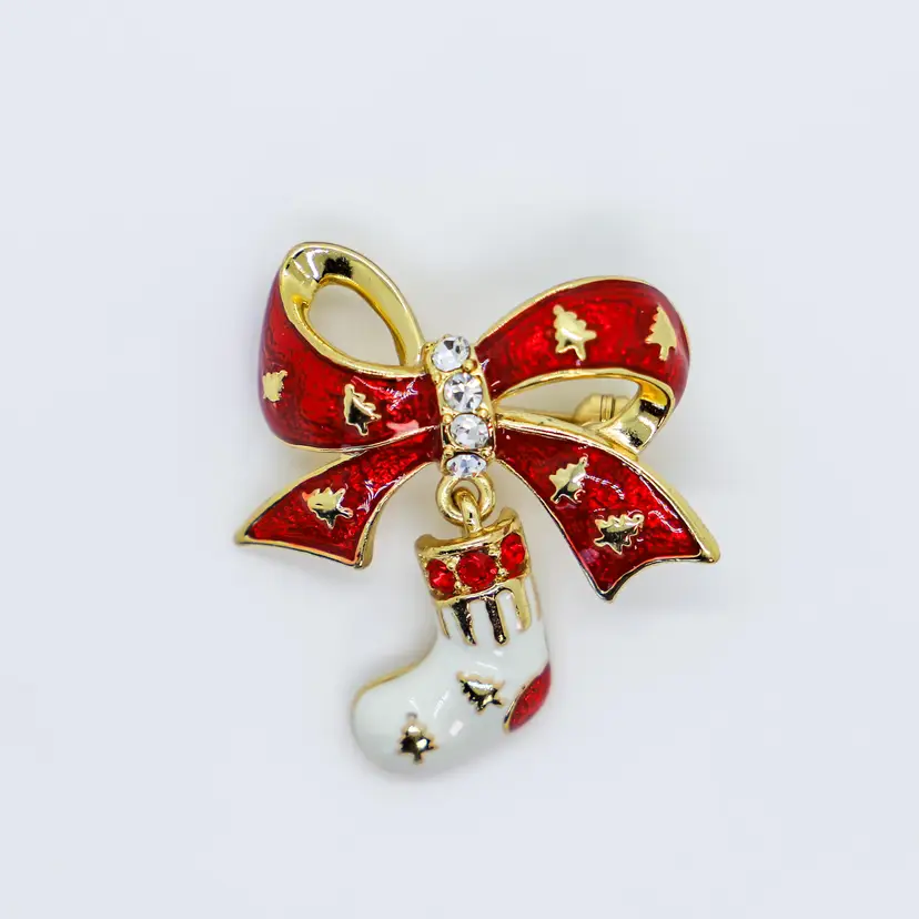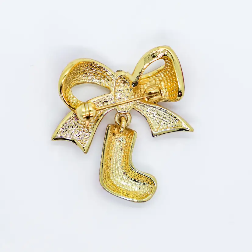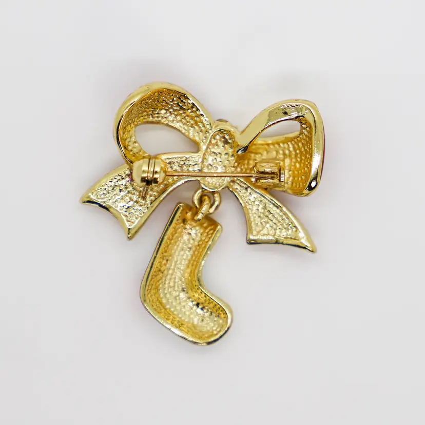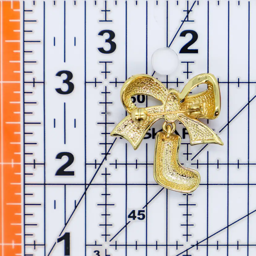 Christmas Brooch Vintage Red Bow with Dangle Stocking Unsigned. Pre-owned Minimal signs of use Cute bow with red enamel, raised tree design and clear czs center detail White enamel stocking dangle charm from center of bow with red cz detail along top of stocking Gold tone 1.5" L See photos for complete description and/or dimensions