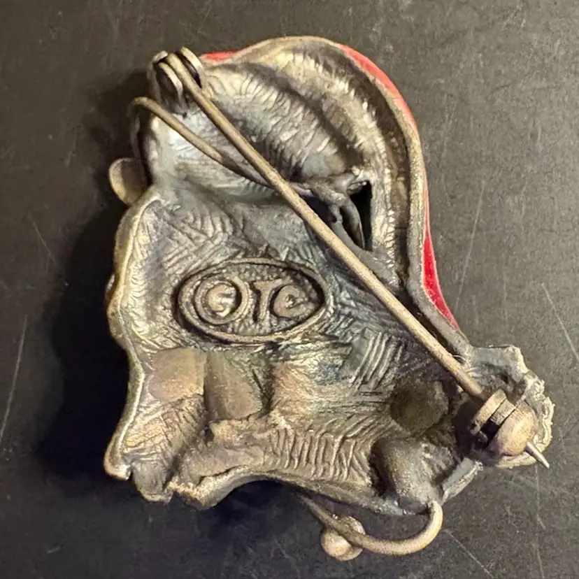 Pewter with enameling, 2” tall, missing a rhinestone. Marked TC