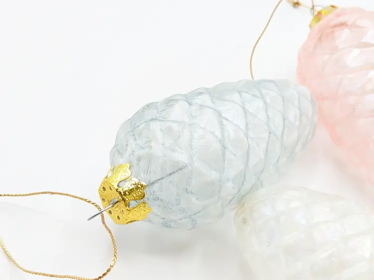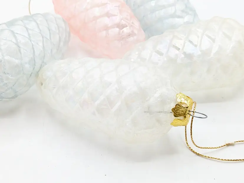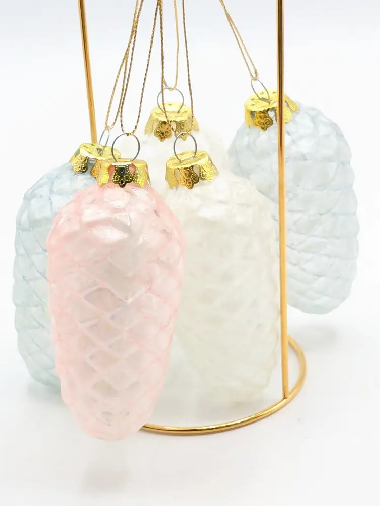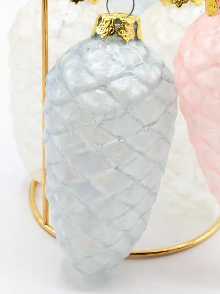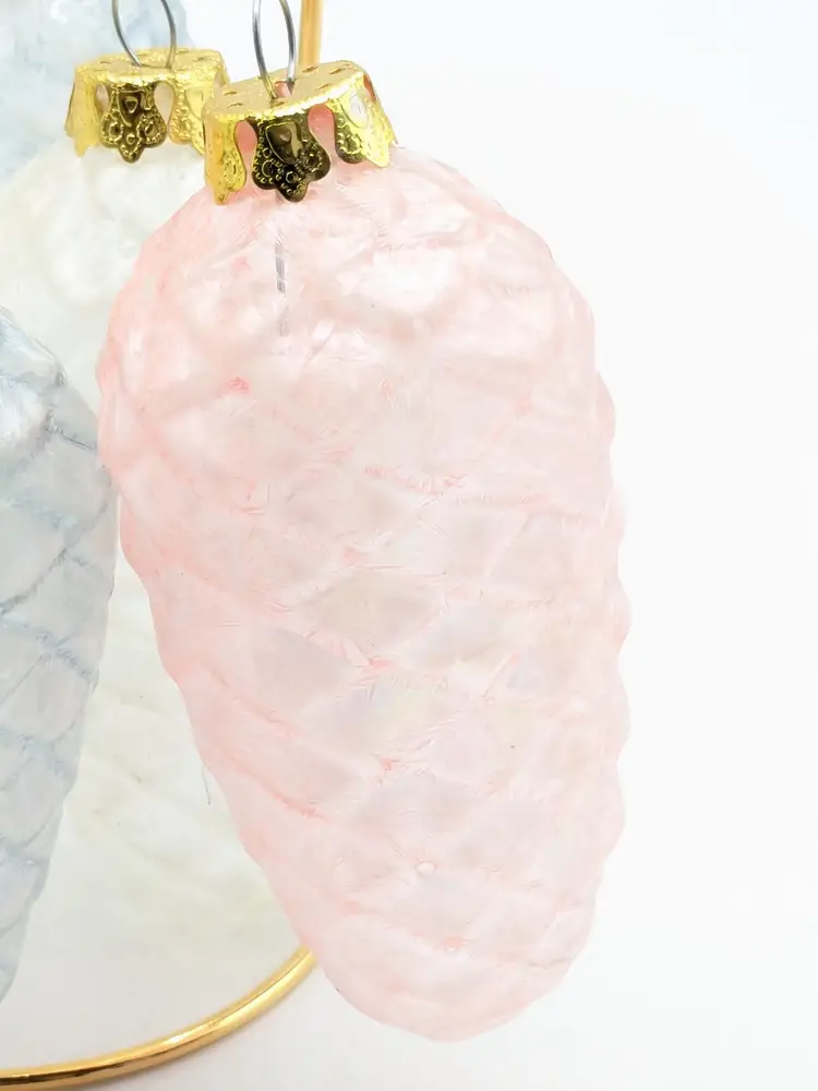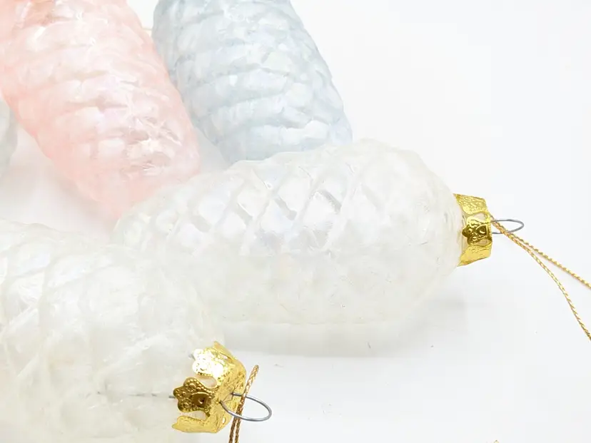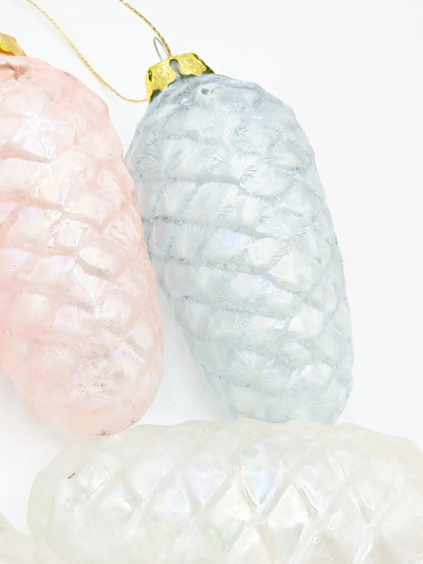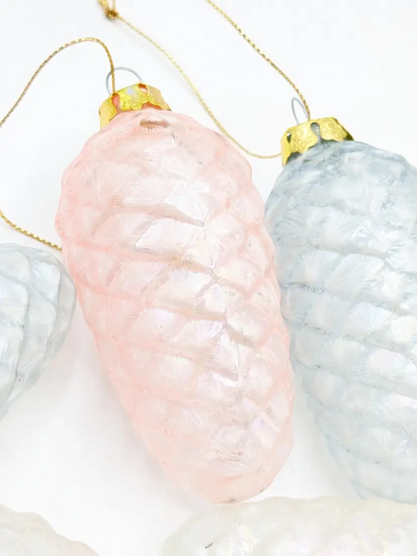 Good condition. Glass. Pastel pink x 1, pastel blue x 2 and 2 white. For a total of 5 pinecone shaped orneys. Measures 4 1/2" in length and 2" wide. ENC31