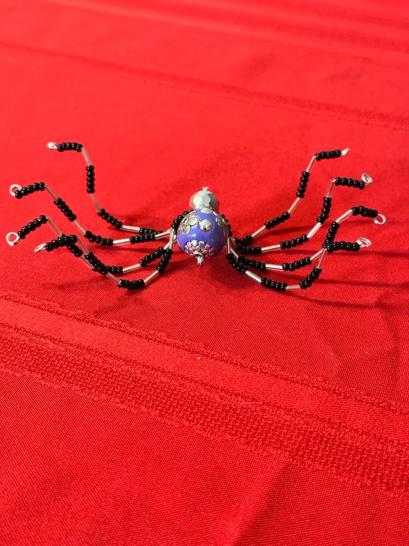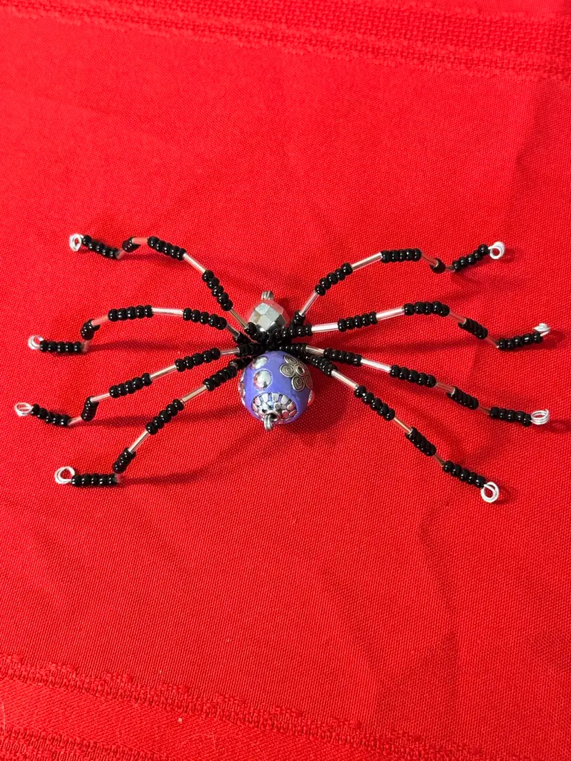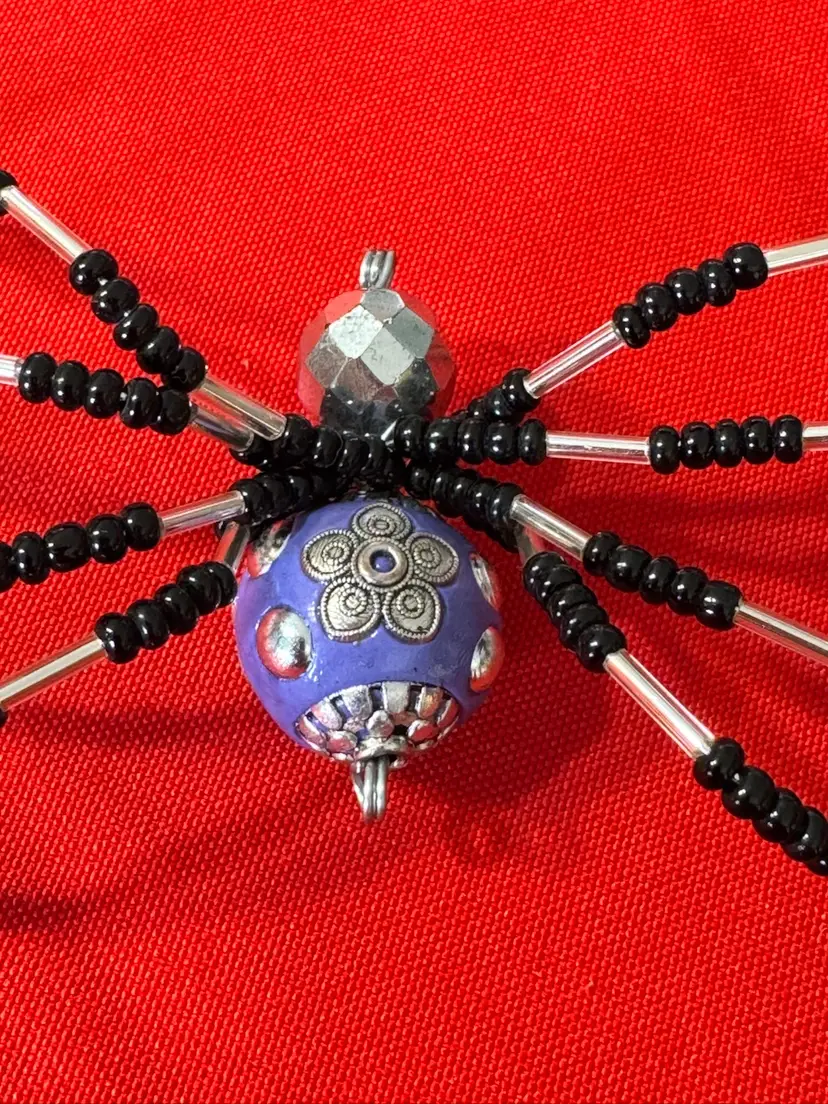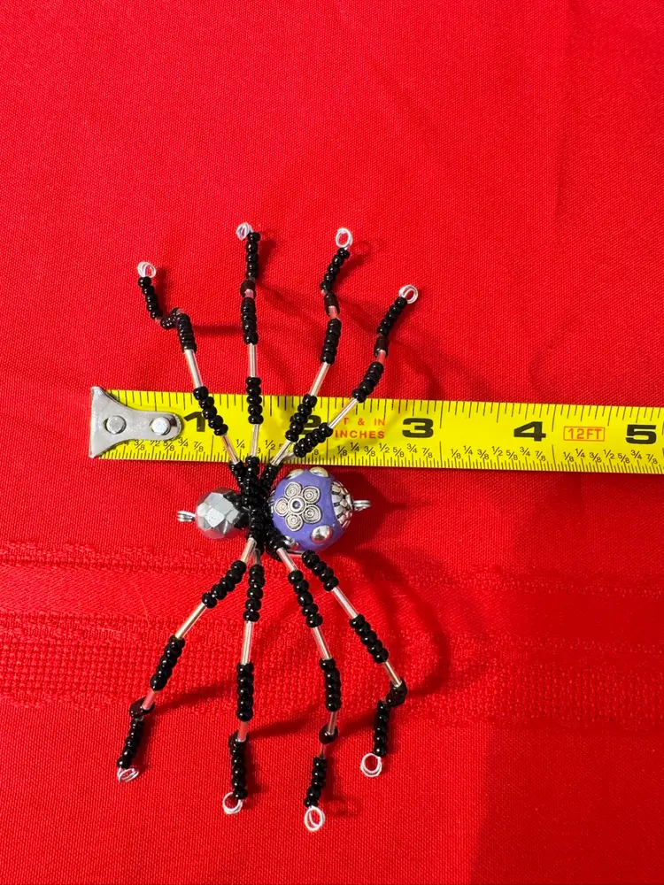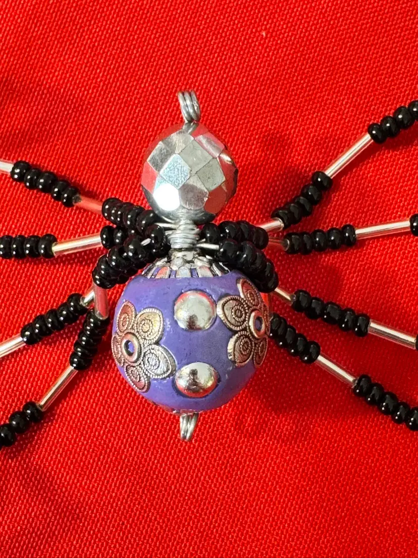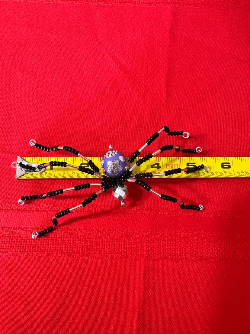 I call these spiders Daddy Ling Legs, pose however you like. Please don’t bend legs too much or they will bread off. Materials: wire, black seed beads, silver bugle beads, head is a faceted silver bead, body is a very pretty purple bead with built in designs. Measurements Apx: 5 in wide x 3 in length.