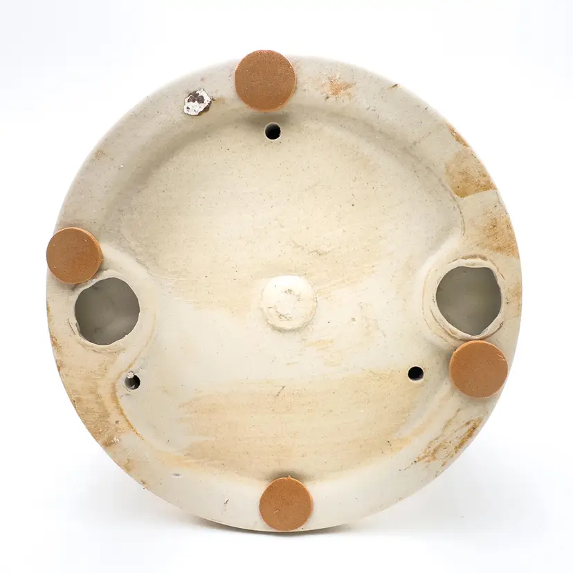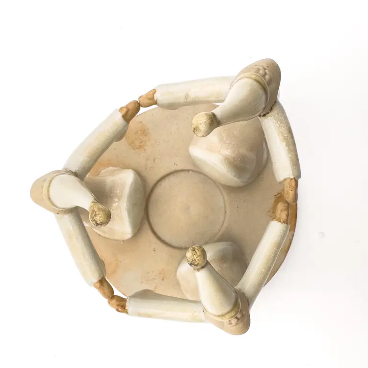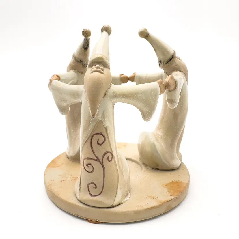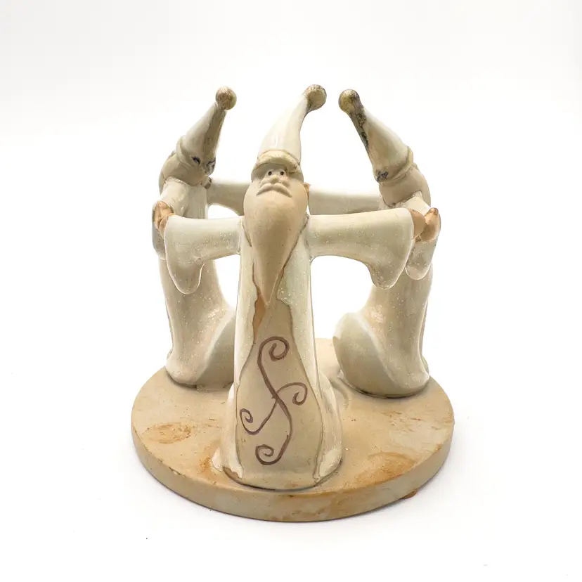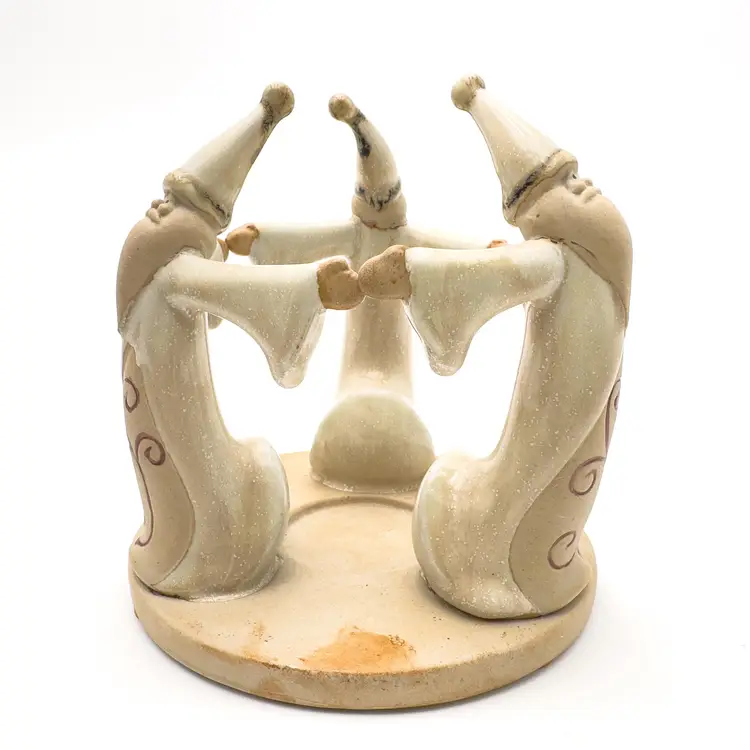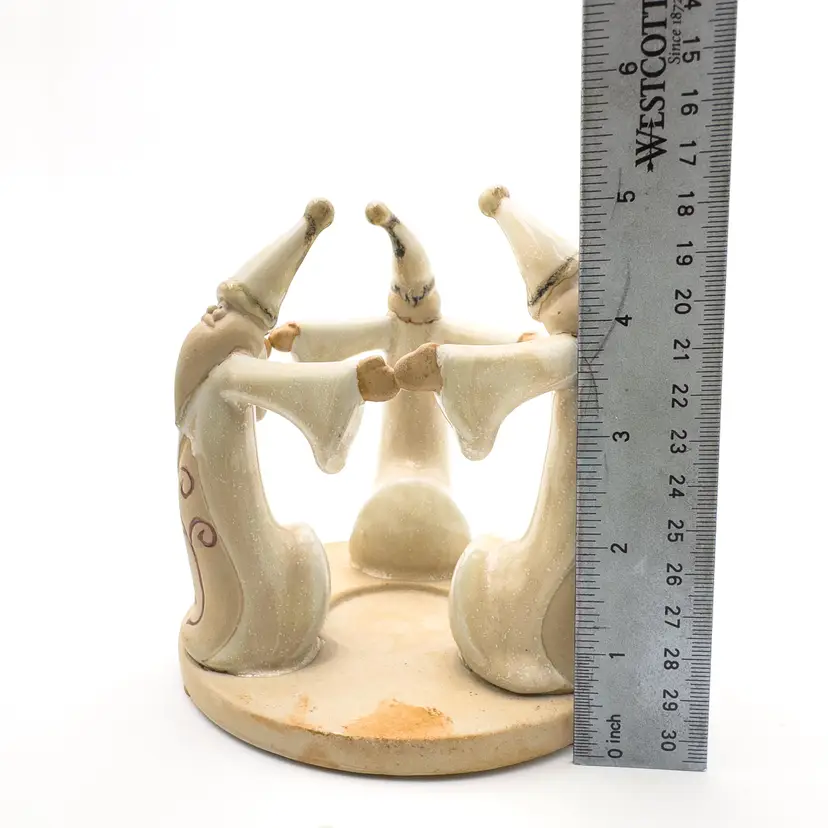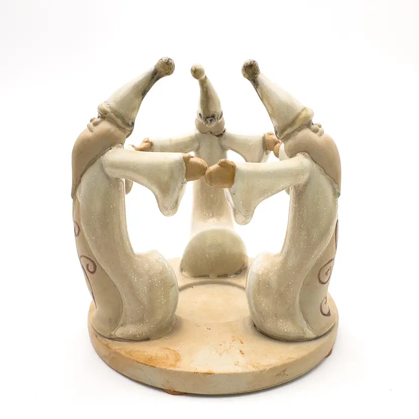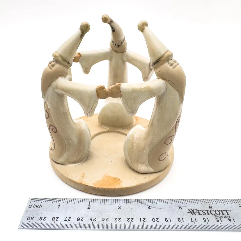 5" H x 5" W Ceramic candle holder Features 3 Santas Holds tea light candle, not included Very good condition, no chips or cracks, see all photos