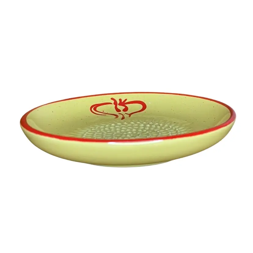 Beautiful Grater plate, garlic, Ginger, lemon/lime zester!! No chips no cracks, just beautiful golden yellow with the little red garlic bulb, red splatter and red rim!