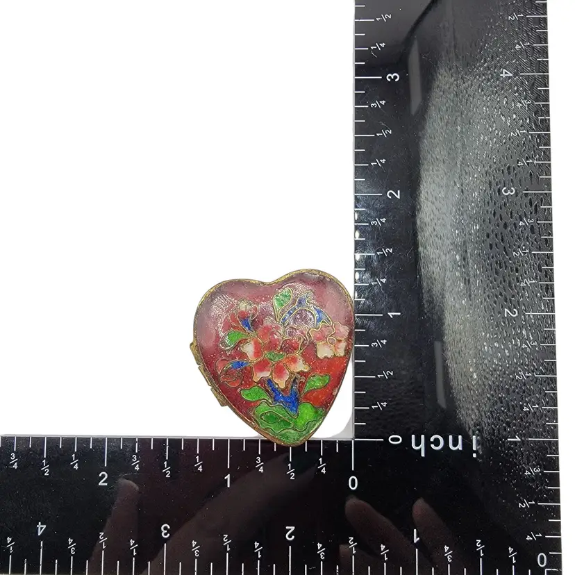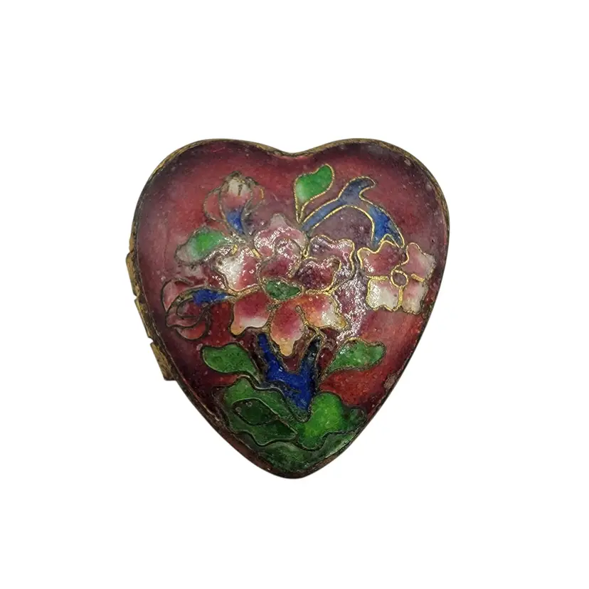• Heart-shaped design • Cloisonné floral artwork • Hinged opening • Deep blue interior