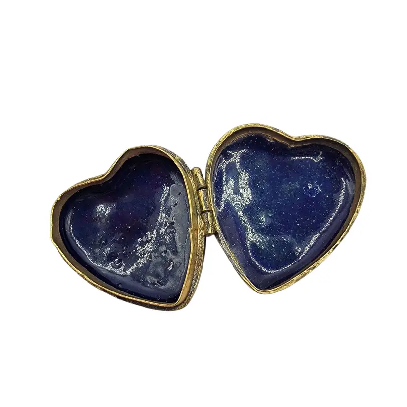 In the heart of a bustling marketplace, this exquisite cloisonné trinket box whispers tales of artistry and elegance. Its floral design, meticulously crafted upon a heart-shaped form, captures the essence of timeless beauty. A secret keeper for cherished memories or precious pills, it opens to reveal a deep blue interior, reminiscent of twilight skies.