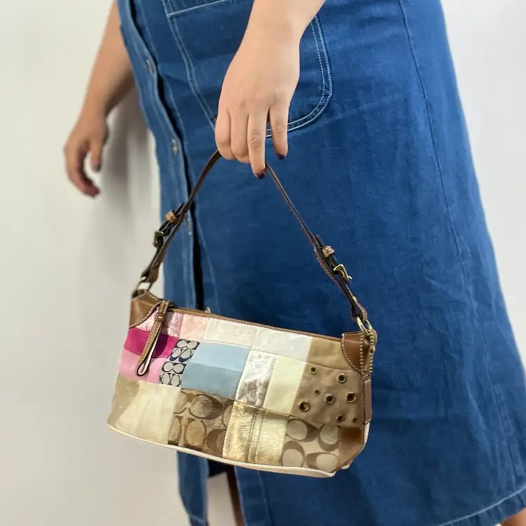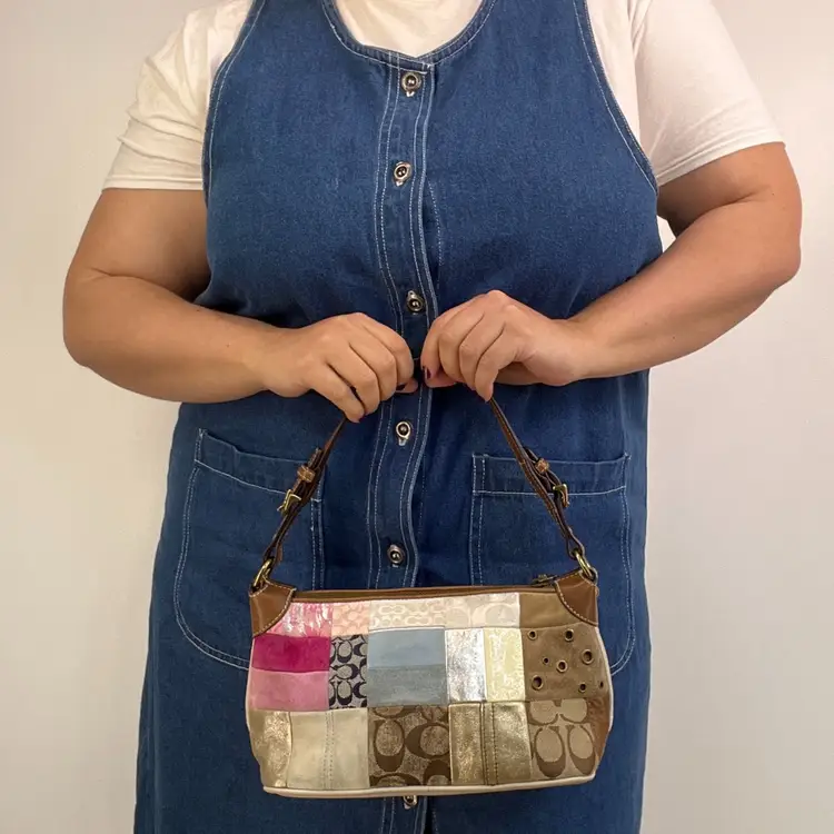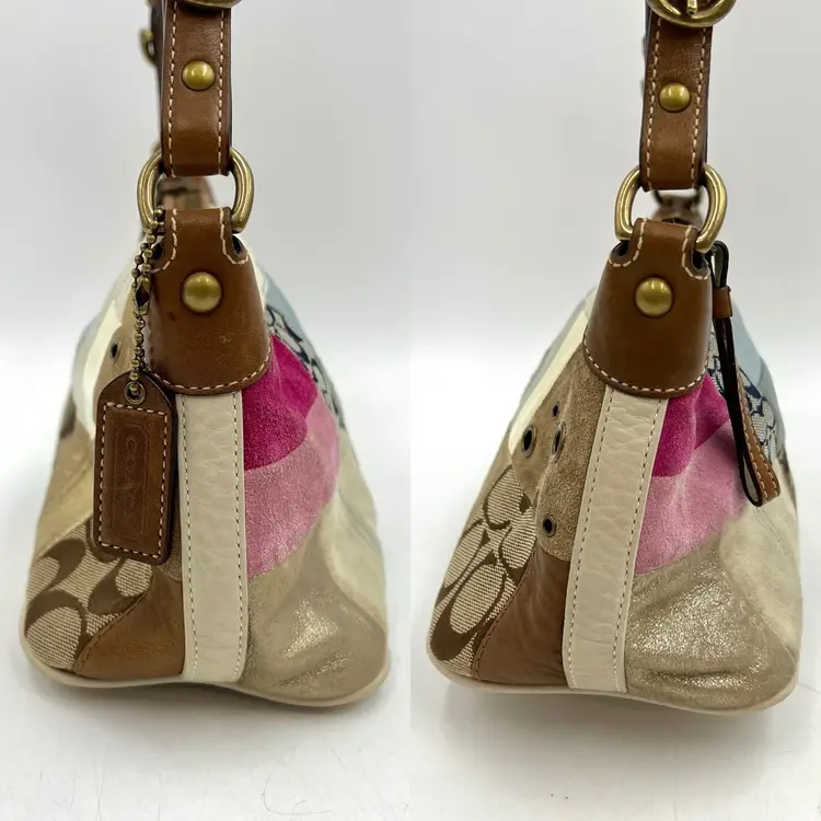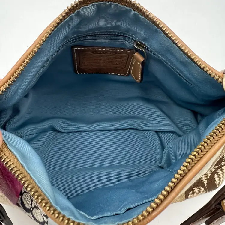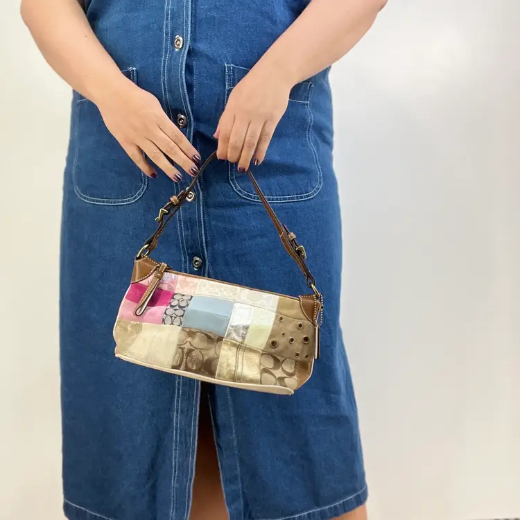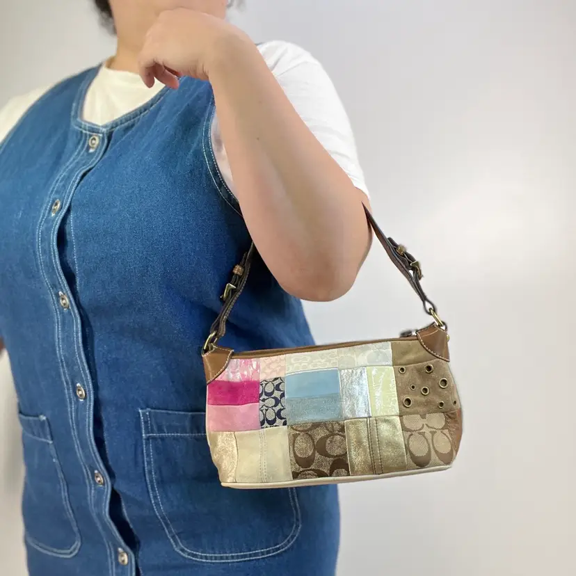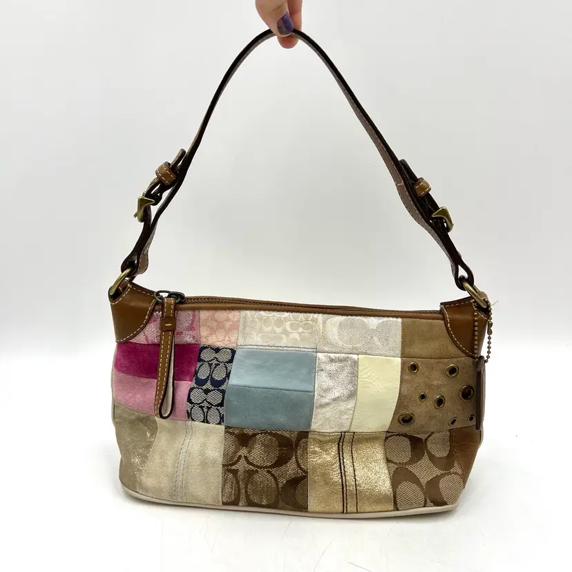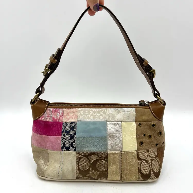 Coach Patchwork Shoulder Bag 2190 Multicolor Leather Handbag Purse Size 9 x 4.50 x 5.50" Drop 7" Preowned item in excellent overall condition. Light cosmetic flaws to the lining. Has been cleaned and conditioned for a new owner. Fits large smart phones and small sundries. Mix of multicolor signature jacquard and leather patches. From 2005.