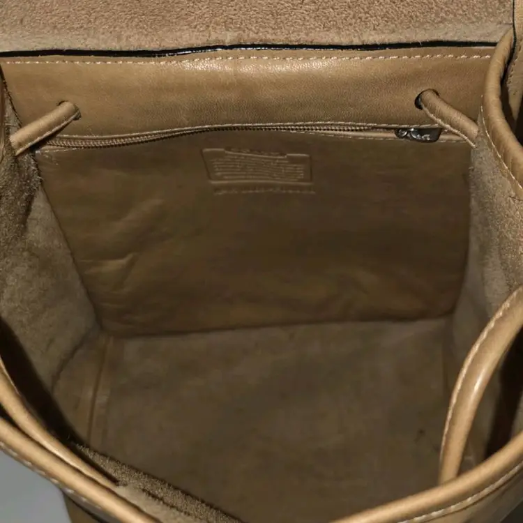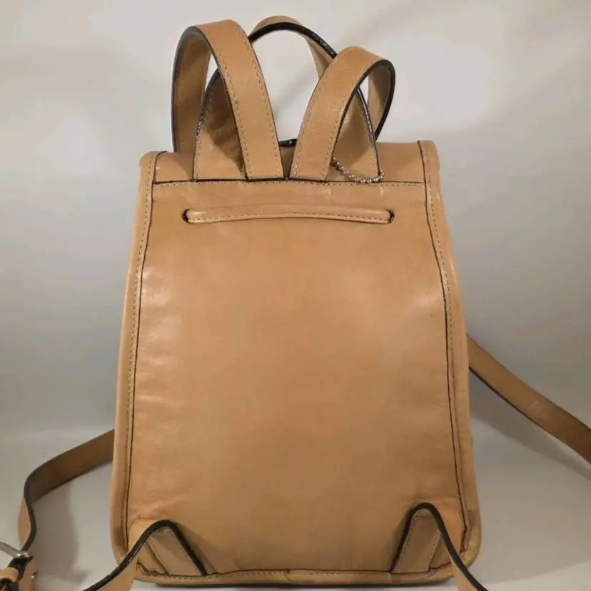 The Coach Camel Tan Soft Leather Turnlock Daypack Mini Backpack Purse Bag is a stylish and versatile accessory suitable for various occasions, including travel, parties, and work. Made from high-quality leather with silver hardware accents, this small-sized backpack features a zip, drawstring, and turn lock closure for added security. The adjustable tan leather straps make it comfortable to carry, while the solid exterior color and classic design make it a timeless piece for any wardrobe. Perfect for both men and women, this Coach bag exudes a 90s-inspired charm with its matte finish and strap accent details.
