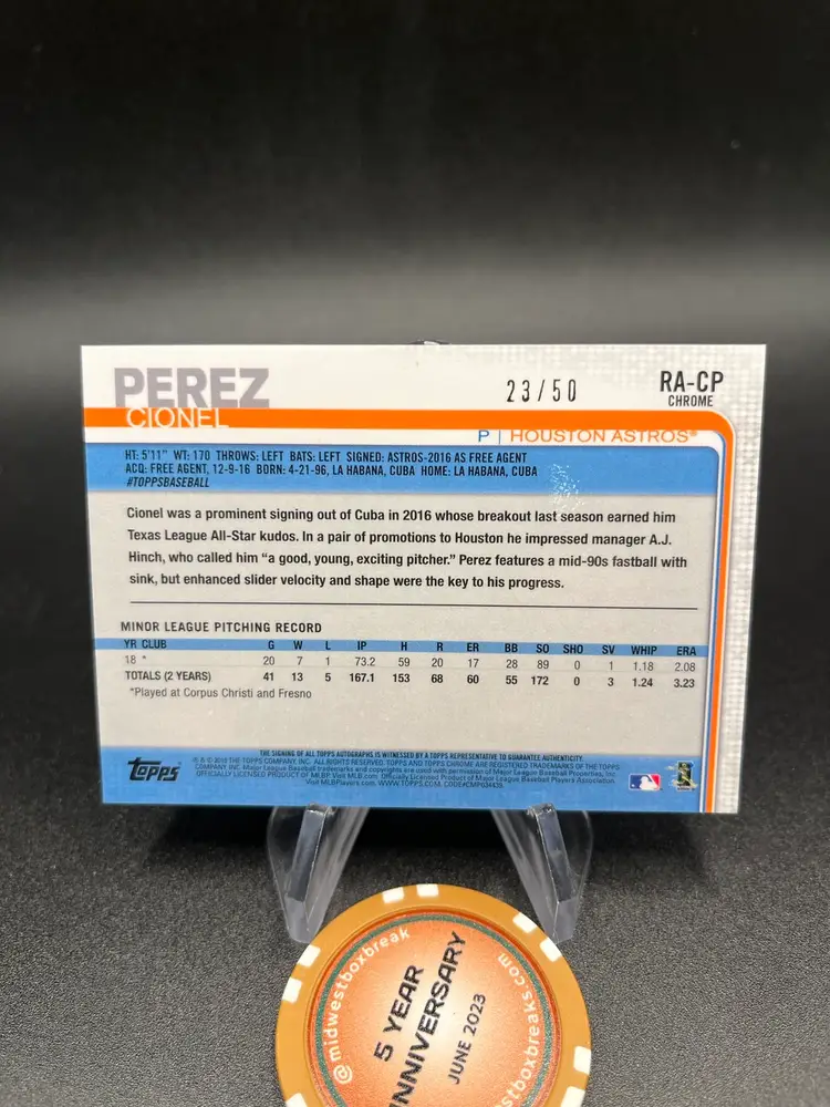 2019 Topps Chrome Cionel Perez gold auto #23/50. Houston Astros.