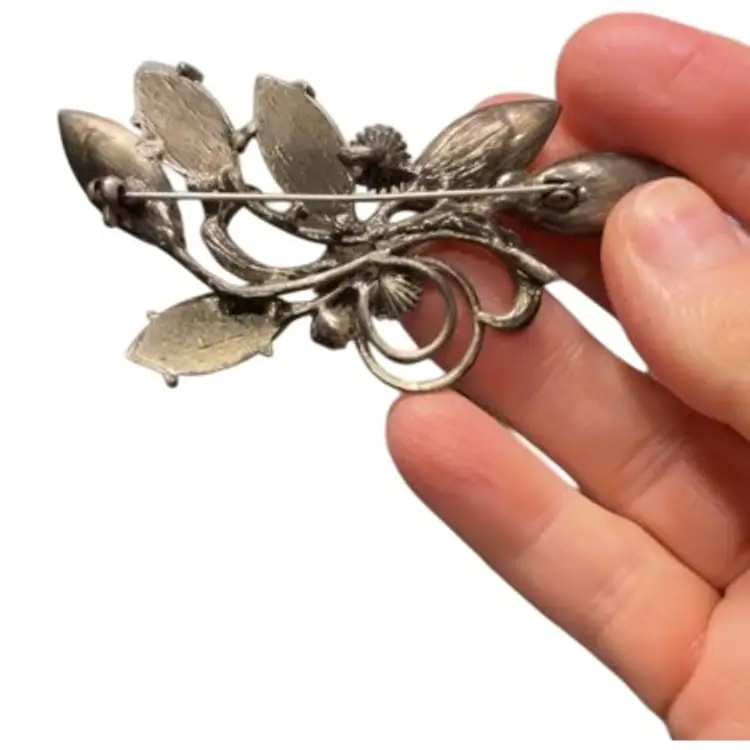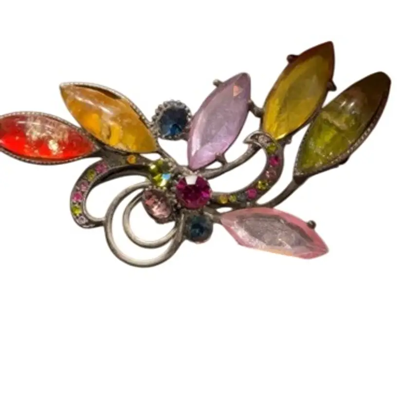 Brooch has colorful rhinestones its tiny red and white small rhinestones. Brooch measures 3”x1 1/2” and it glows. Pin not holding “As is”
