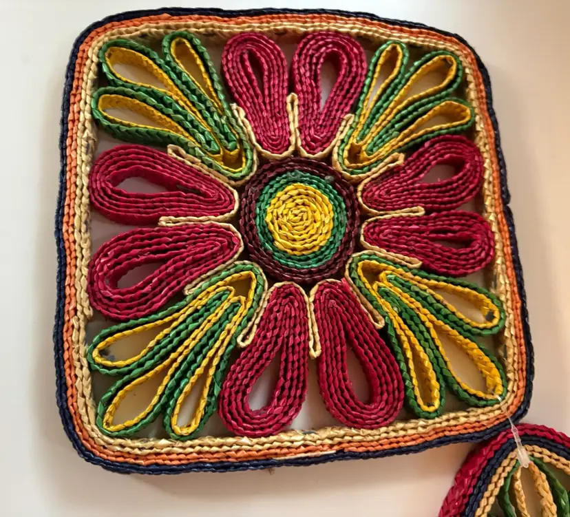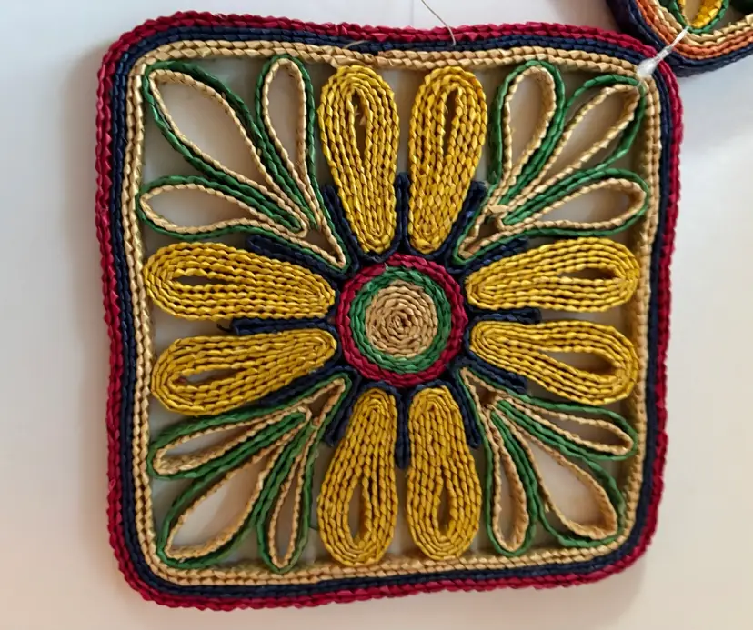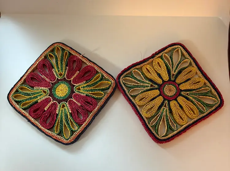 Set of two Rafia trivets. Great for decorative use or in the kitchen. Vibrant colors, excellent condition.