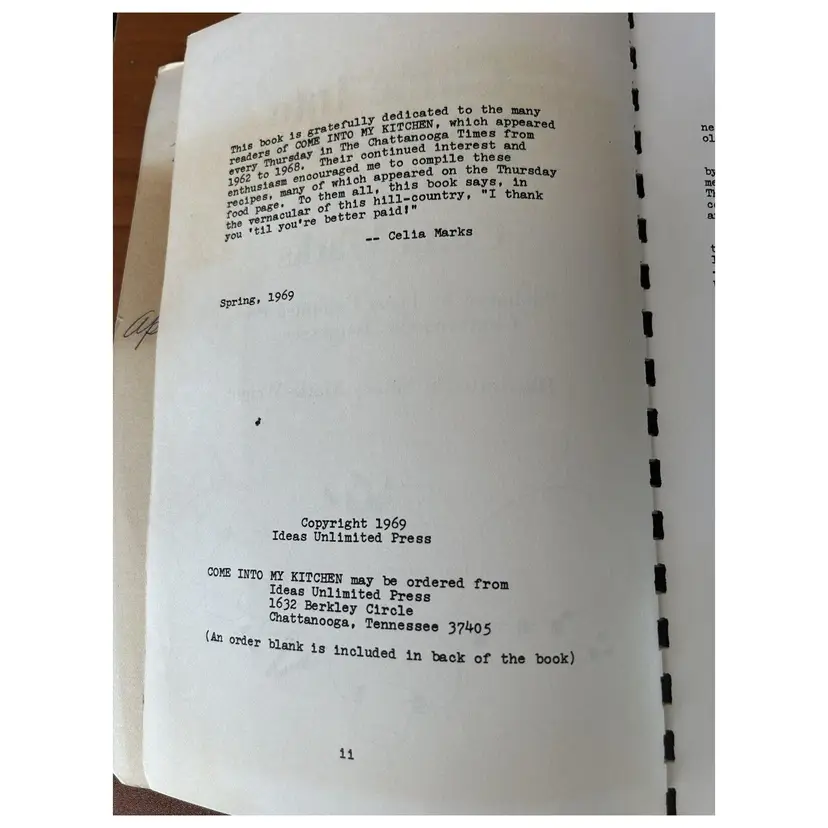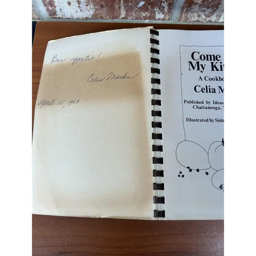 This cookbook, titled "Come Into My Kitchen" and signed by author Celia Marks, is a vintage gem that any cooking enthusiast would love to have. The 3rd printing from 1969 features 291 pages of delicious recipes, with a spiral-bound format that makes it easy to use in the kitchen.