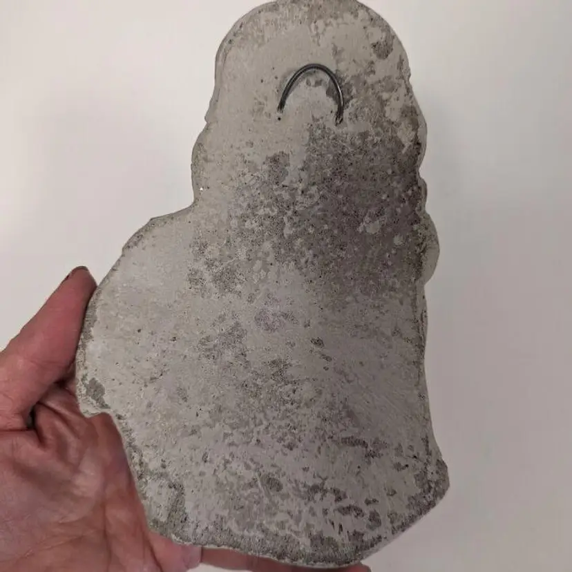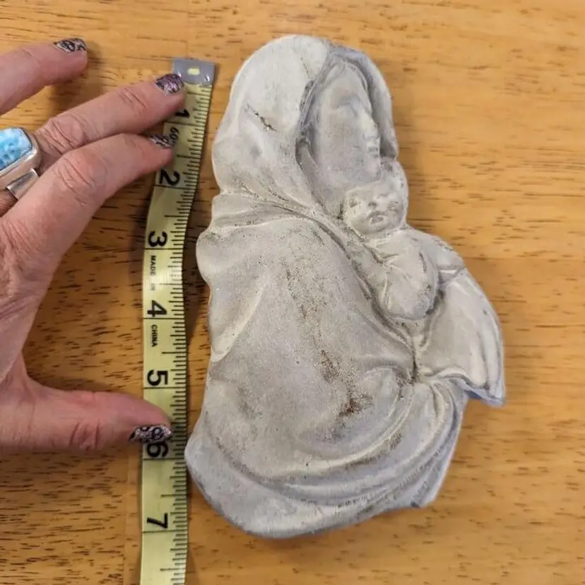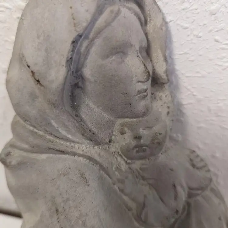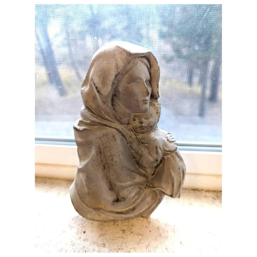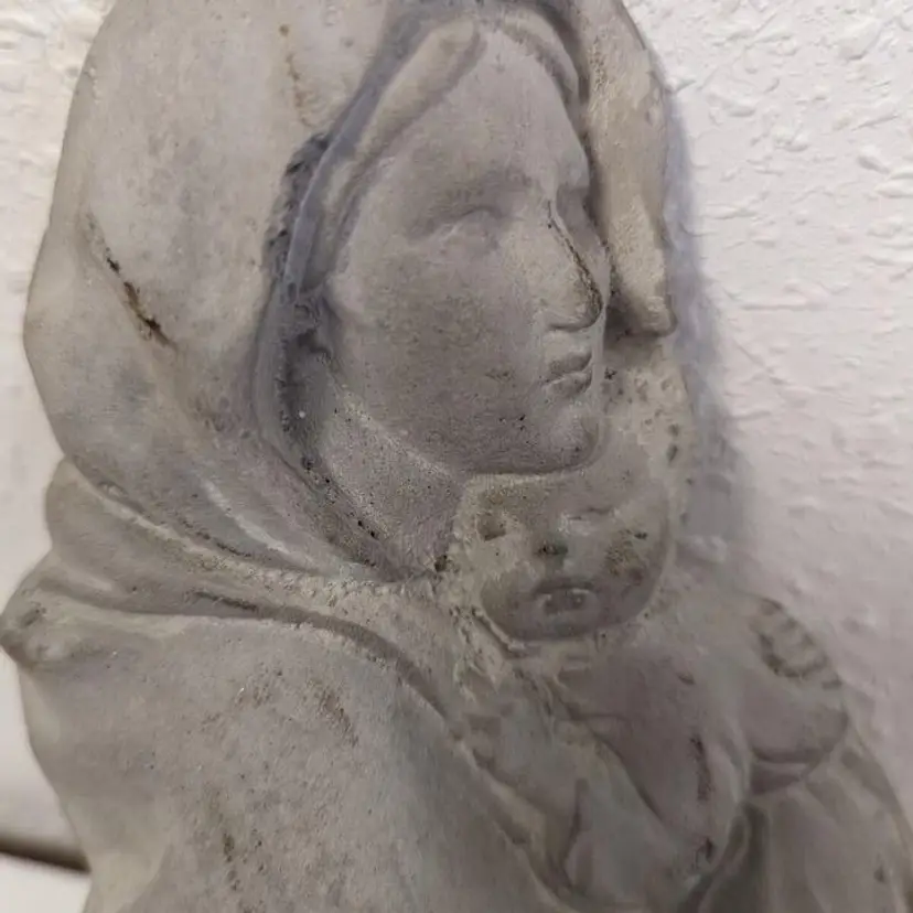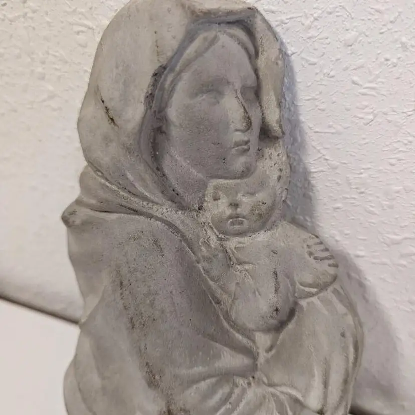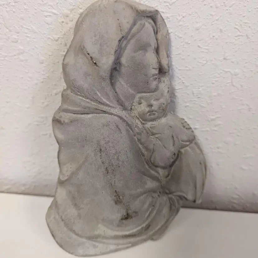 “Good used condition. Does show light wear (see photos), but I think it just adds to it's charm. 7" tall. Weighs over 1 pound, but ready for hanging.This beautiful wall hanging features the Madonna and Child, a symbol of motherly love and devotion. The piece is crafted from durable concrete, ensuring its longevity and ability to withstand the elements. It would make a wonderful addition to any home or garden, serving as a reminder of the importance of faith and family. The item is perfect for collectors of Christian memorabilia or anyone looking to add a touch of religious sentiment to their decor.