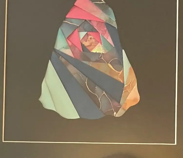 Contemporary collage artwork of a dress composed from different folded shapes and colors of pieces of paper set behind a cutout shape in black paper which is bordered by a black mat. It is beautiful in person!! No artists signature! Measurements: Overall: 11 1/2" by 14". Image inside the white line: 7 1/2" by 9 1/2". Almost 2 lbs before packaging.