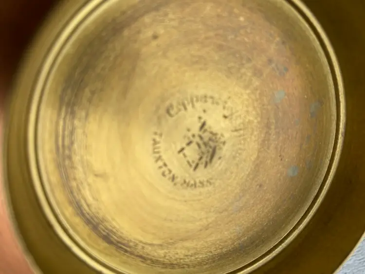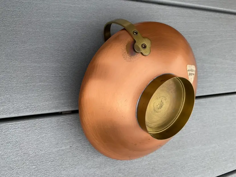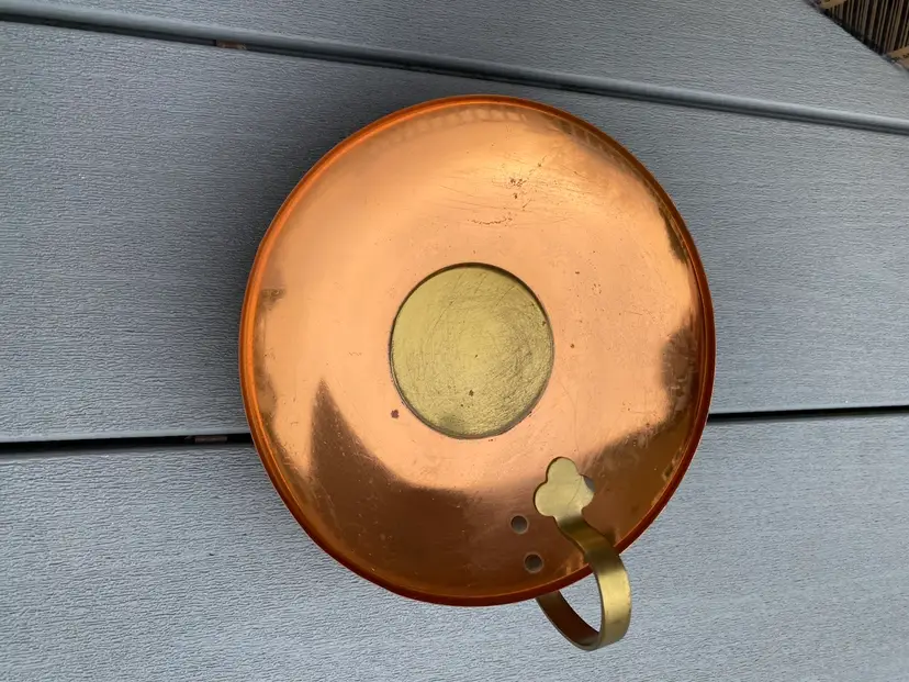 This is a vintage copper and brass candle holder made by Coppercraft Guild as stamped on the bottom. It also has a sticker that says solid copper. This type of candle holder is also known as a chamberstick or chamber candle holder. It features a wide shallow bowl, a polished copper surface, and a brass handle. It is in very good vintage condition.