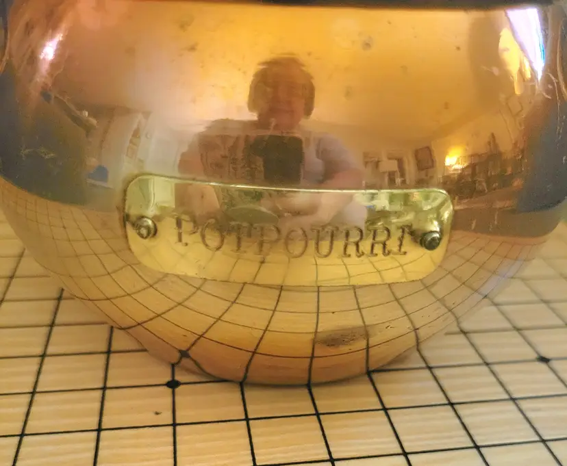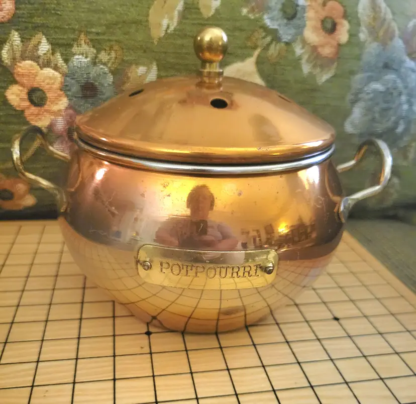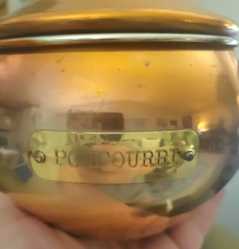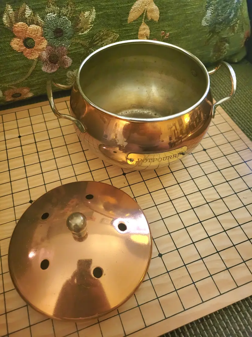 Great little simmer pot with brass handles. Copper is worn, definitely well used but still cute.