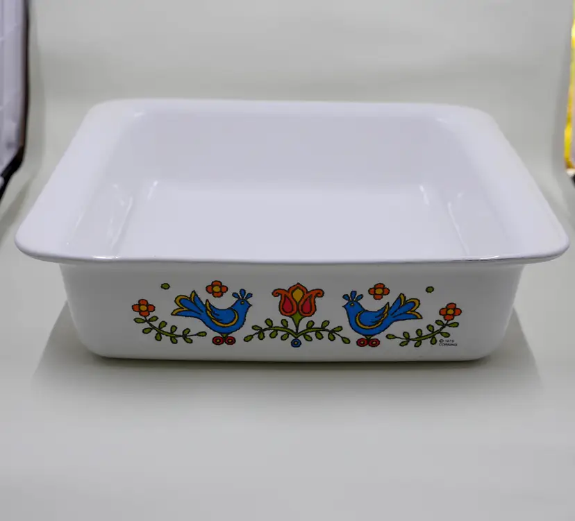 A white 8" square ceramic baking dish featuring the Country Festival pattern, a popular design by Corning Ware with blue birds and stylized floral images in blue, yellow, and orange. Released back in 1975-76, the dish is in excellent condition, ready for some fresh brownies. It's marked with the classic Corning Ware back stamp.