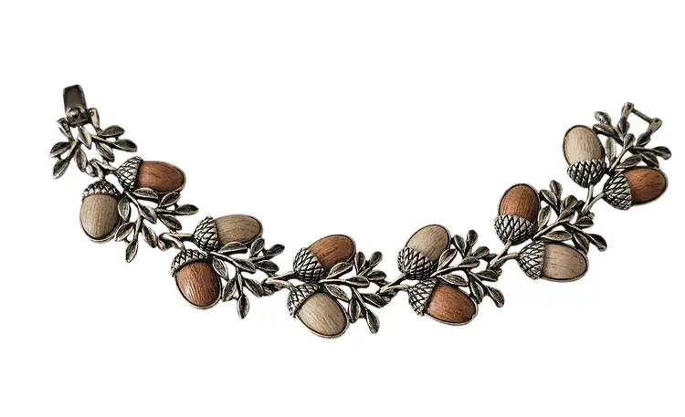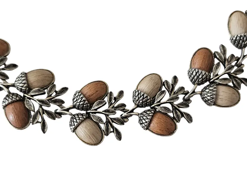 Acorns are known to be a symbol of gratitude and hospitality, widely popular on Thanksgiving and other Fall season events. This pair consists of a wonderful acorn necklace and bracelet jewelry set, made by Coro for sale at Knott's Berry Farm in the 1950s and 60s. It features acorn components simulated to look like a shell of an acorn, further adorned with textured gold tone leaves and acorn caps. These acorns are linked together forming the length of both necklace and bracelet. These autumn-themed pieces will add the perfect touch to your ensemble for the Fall season. The matching elements and detailing enrich the design, making this piece stand out. The necklace measures 16 inches in length and the bracelet measures 7 inches long. These are unsigned Coro pieces, and the exquisiteness of each piece illustrates the elegance and sophistication attributed to Coro jewelry.