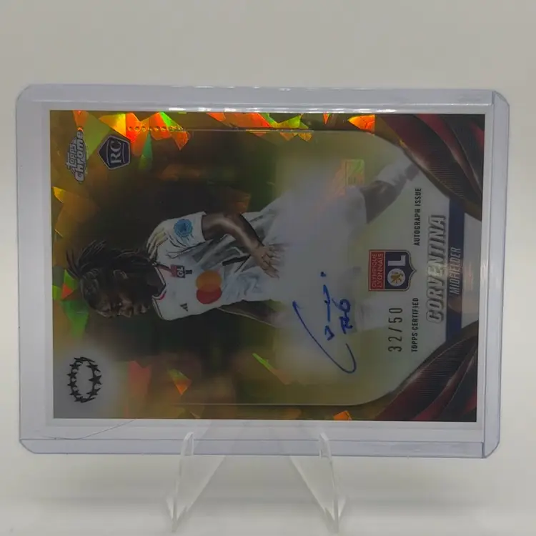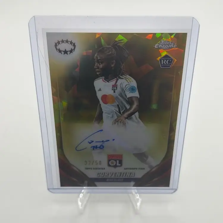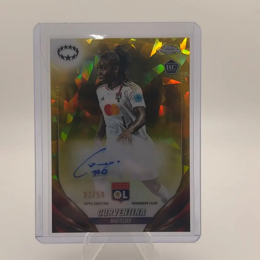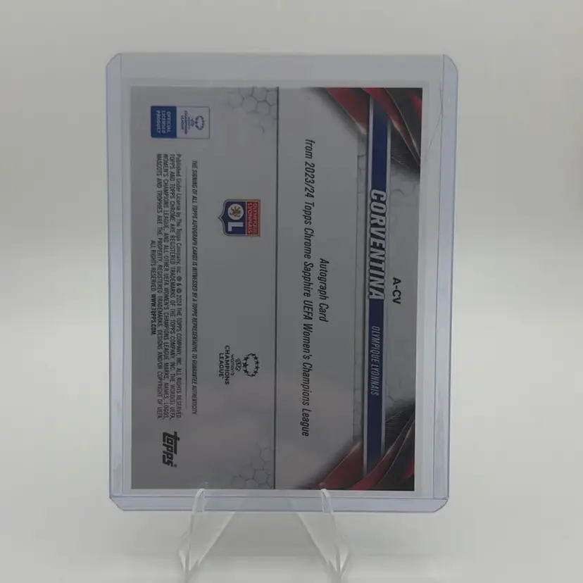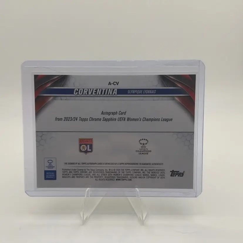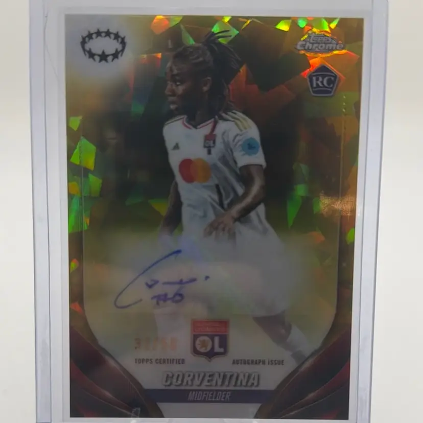 Autograph card from 23/24 Topps Chrome Sapphire UEFA Women’s Champions League. Pictured in penny sleeve and top loader. Numbered 32/50. Rookie card for the Olympique Lyonnais
