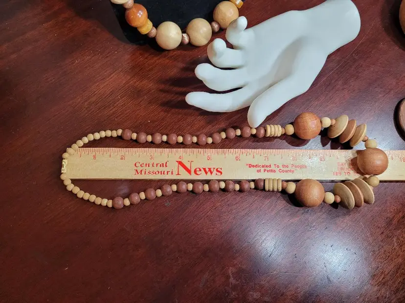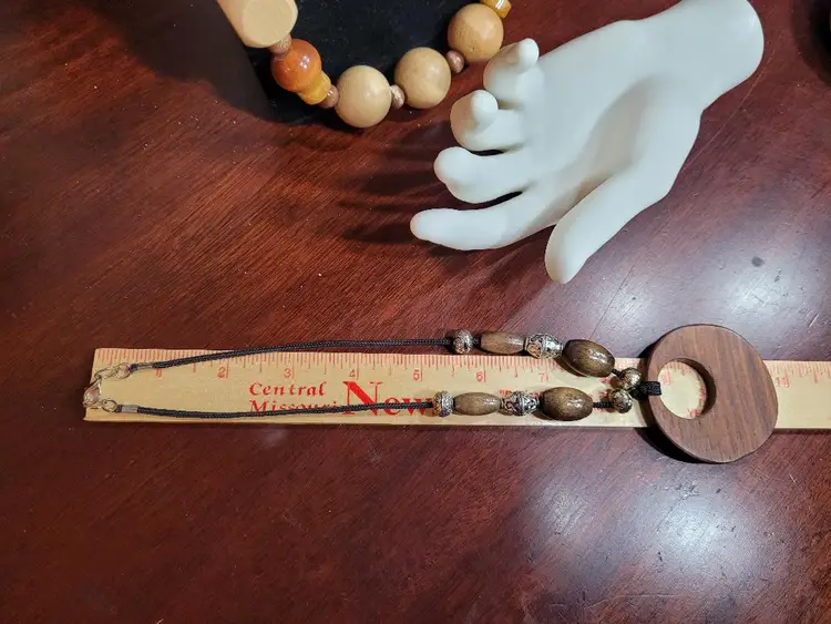 I have for sale a set of three wooden beaded necklaces and one wooden and gold accent bracelet. The bracelet is a solid 3 inch diameter and could use a good wood oil treatment. But it is solid. The first necklace is on a black cord with silver accent beads with dark wood beads leading to a dark wood pendant. It is 16 inches long and has a lobster claw clasp. The second necklace is a combination of light and dark wood beads and a variety of sizes. It is 22 inches long with a gold tone barrel clasp. The last necklace is a mix of light and dark and medium tone wooden beads that is 32 inches long with a gold tone spring load clasp. This one has a great SHINE to it. All these are in good condition. GREAT little collection.