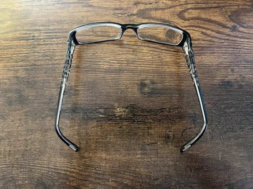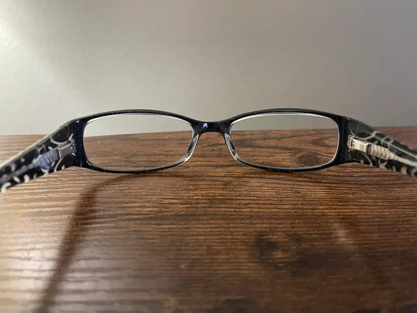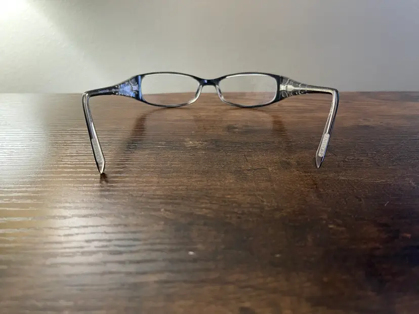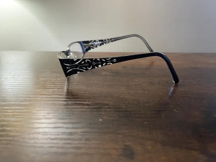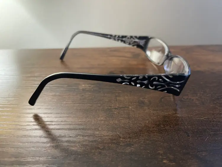 Condition Description: These black eyeglass frames with silver floral detailing are in pre-owned, very good condition. The frames show minimal signs of use consistent with gentle handling, with no cracks, chips, or major scratches visible on the surface. Hinges open and close properly, and the arms sit evenly. Overall, these stylish women’s eyeglass frames have been cleaned and inspected and are ready for use or customization with new lenses.