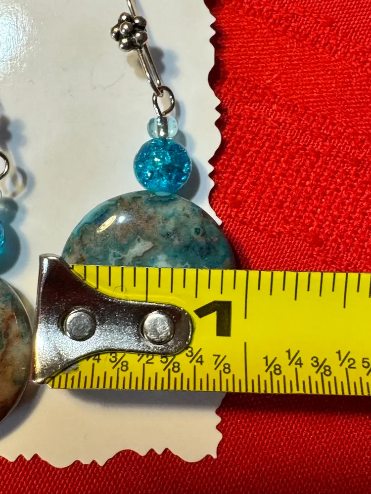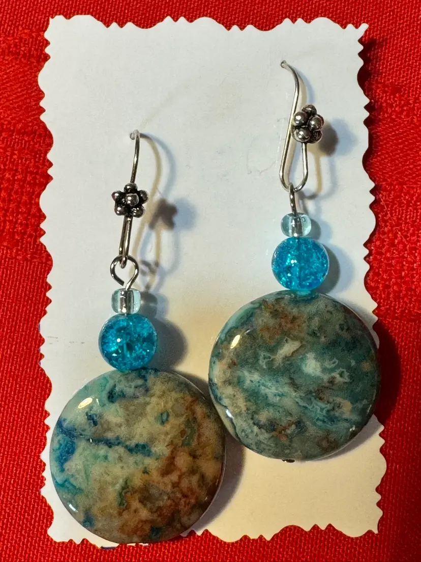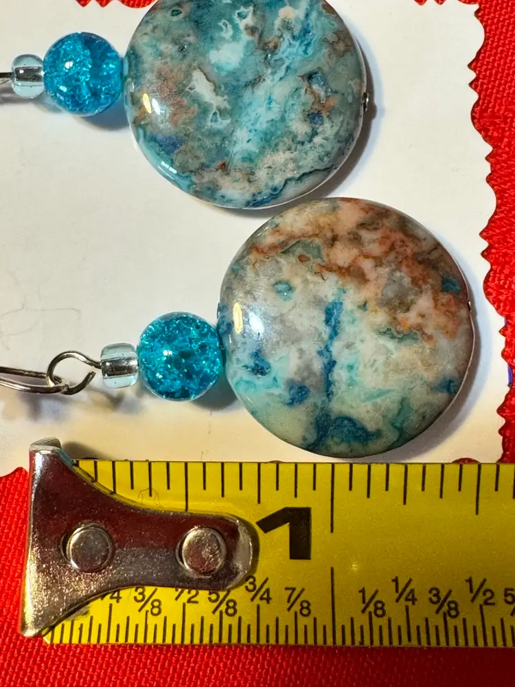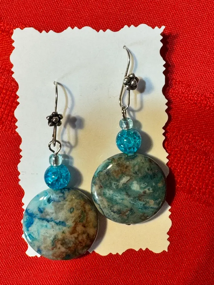 Made with 1 in crazy lace agate, fiery blue round beads, powder blue seed bead, ear wire has a flower on it.
