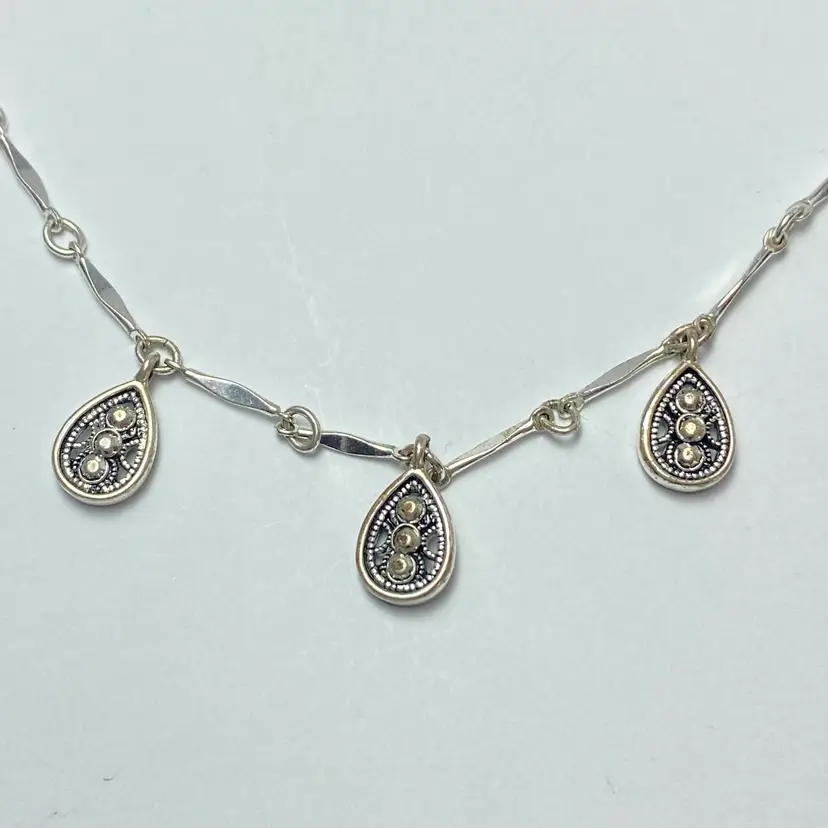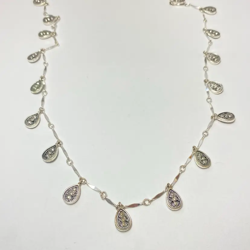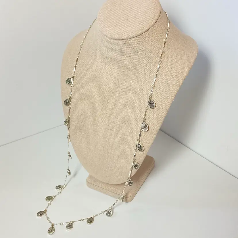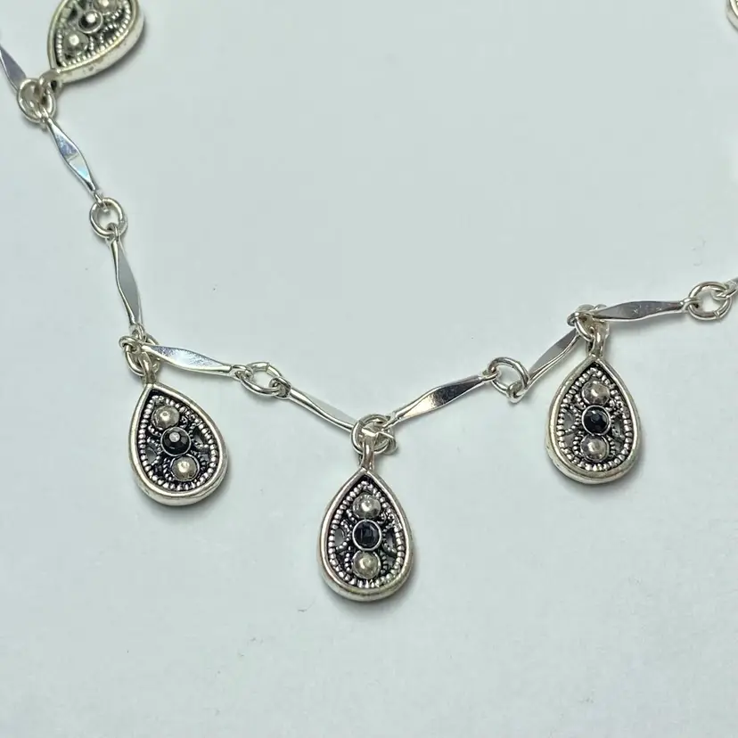 Crown Trifari Silver Tone Marcasite Tear Drop Filigree Station Chain Necklace. Very good condition. Please see pictures for details. SMOKE FREE/PET FREE HOME Approximate measurements: Adjustable Length- 32" to 34"