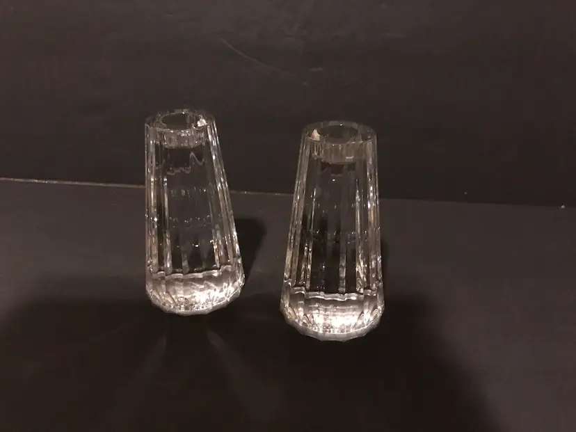The Crystal 2 Candlestick Holders by Paloma Picasso for Villeroy & Boch in 1990 are elegant and stylish additions to any room. Made of crystal with a glossy finish, these abstractly-shaped candle holders feature rhombus designs and are engraved with a Bohemian pattern. Perfect for all occasions, these medium-sized holders are suitable for windows or furniture and are easy to clean with a damp cloth or warm water. Produced in Germany, these original late 20th-century pieces are a timeless tribute to abstract art and ribbed glass design.