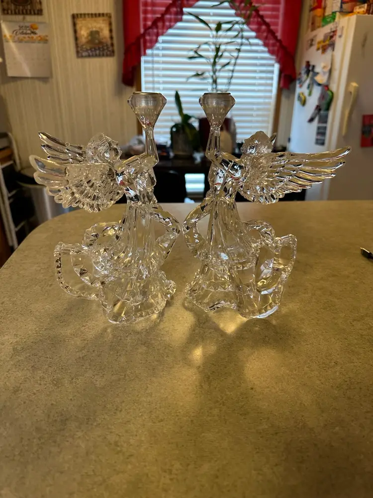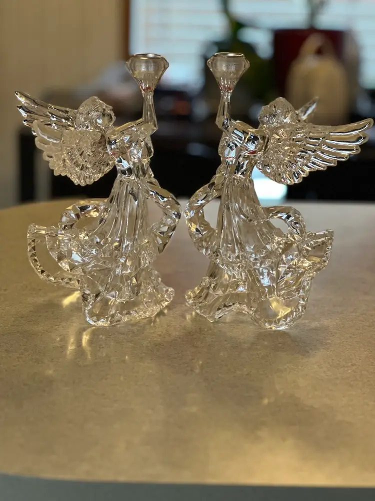 These plastic angel candlestick holders were produced by RAZ Imports, a company known for decorative seasonal and holiday items founded in 1979. The pieces feature clear acrylic material designed to mimic the appearance of cut crystal, with detailed angel figures holding candlesticks.