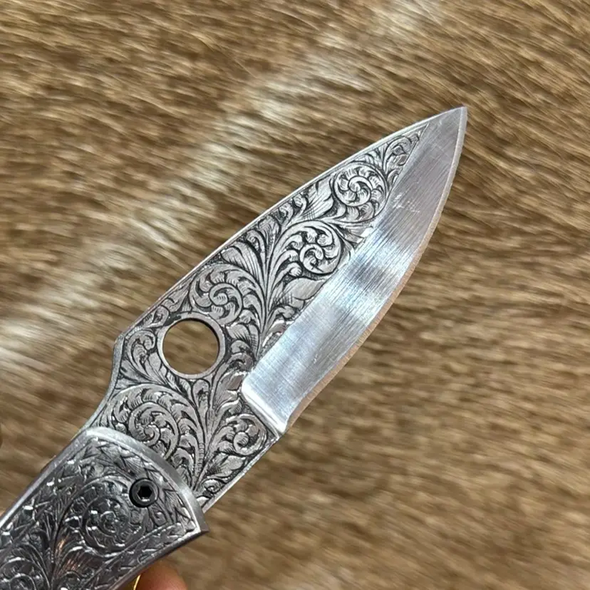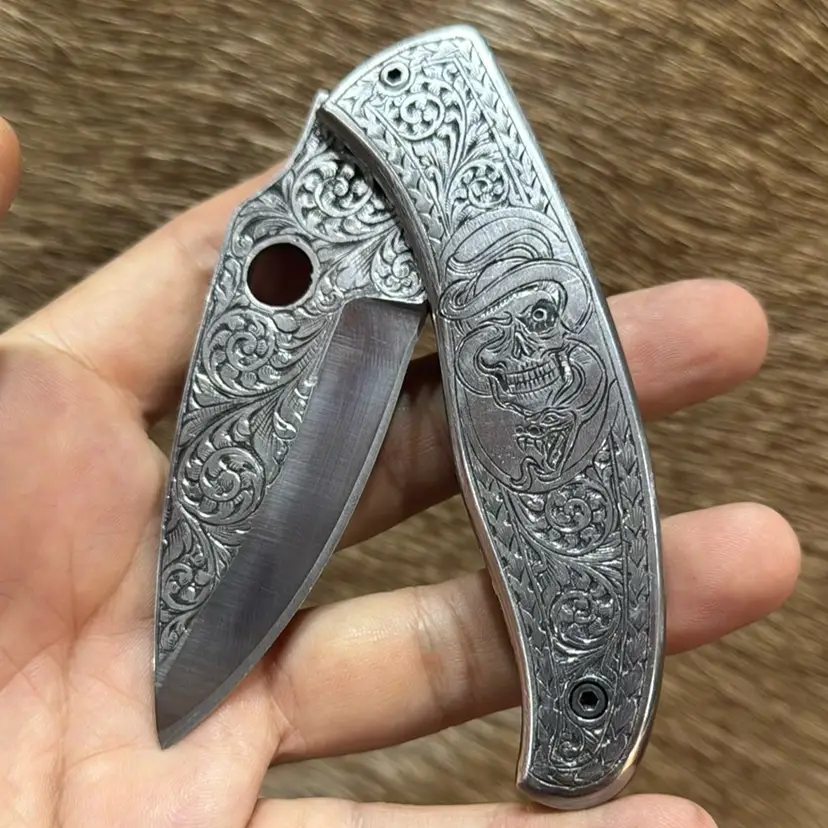 Custom made Caron steel with hand engraved knife. It comes with sheath. It’s great for give.