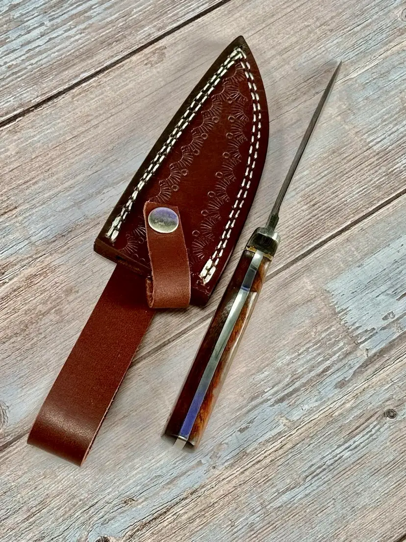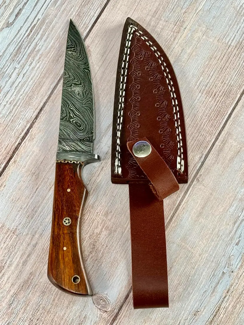 It’s beautiful custom made Damascus steel skinner knife with rosewood handle. Over all length about 8 inches and comes with leather sheath.