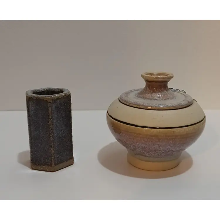 Two Mini Dainty stoneware vases with tiny flower applied decorations; nice pink and periwinkle tones; smallest one is signed Wild Rose; 4 in. Tall x 3.5 in. wide