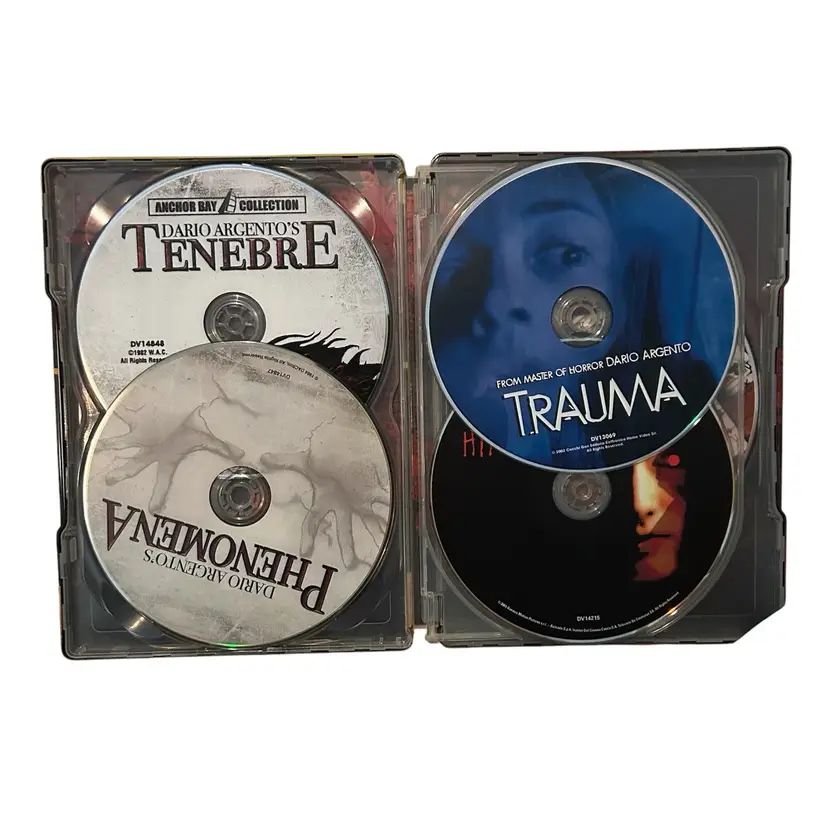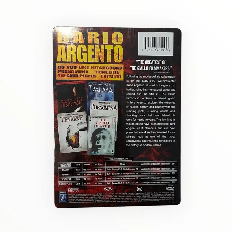 Dario Argento 5 Disc DVD Metal Case Horror Box Set Anchor Bay Collection. Pre-owned excellent condition. Classic uncut & uncensored films exploring the extremes of murder, insanity and brutality, stunning visuals, and shocking plots.