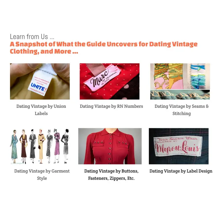 Grab this digital download and comprehensive guide to dating vintage clothing by era, material, label, designer, tag, font style, buttons, fastens, zippers and more.