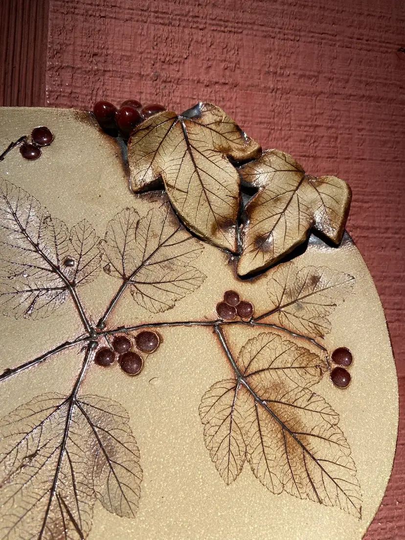 Approx 10.5l x 7.5w x 0.5h. Signed Karen Olson 2011 (?). Relief and carved leaves and berries. No chips or cracks. Excellent used condition. See images as part of description.