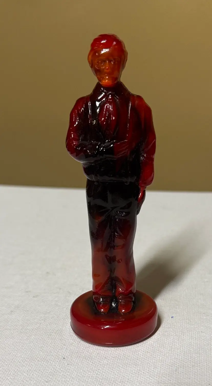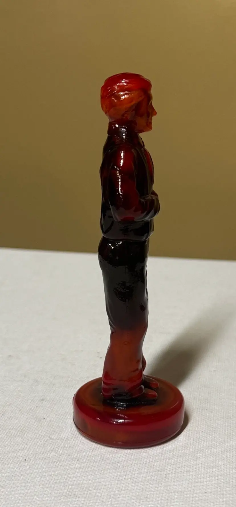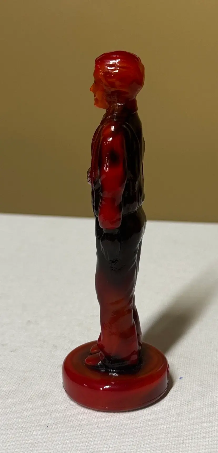Degenhart Glass John Alden Ruby Red 5 1/4" Figurine with cadmium orange and uranium green glow under black light The figurine is called John Alden. He is about 1 3/4 inches wide by 5 1/4 inches tall. There are no chips or cracks. The figurine is marked with the Degenhart logo "D" inside a Heart with a line under it. This means this was made for the Degenhart Glass Museum gift shop and was made by Mosser Glass. This was only available at the Museum Gift Shop. These are hard to find as there were only a limited number of pieces made. This would make a great addition to your collection. Excellent condition with no breaks or chips (122411525nya)
