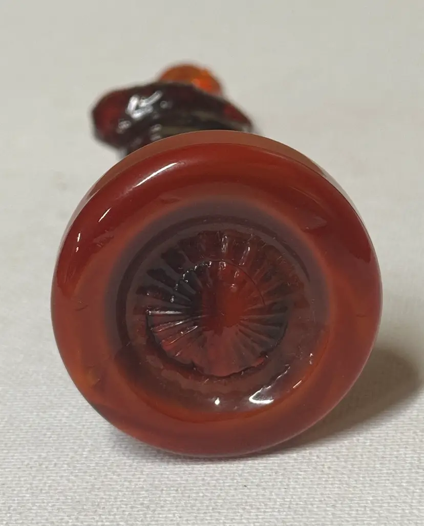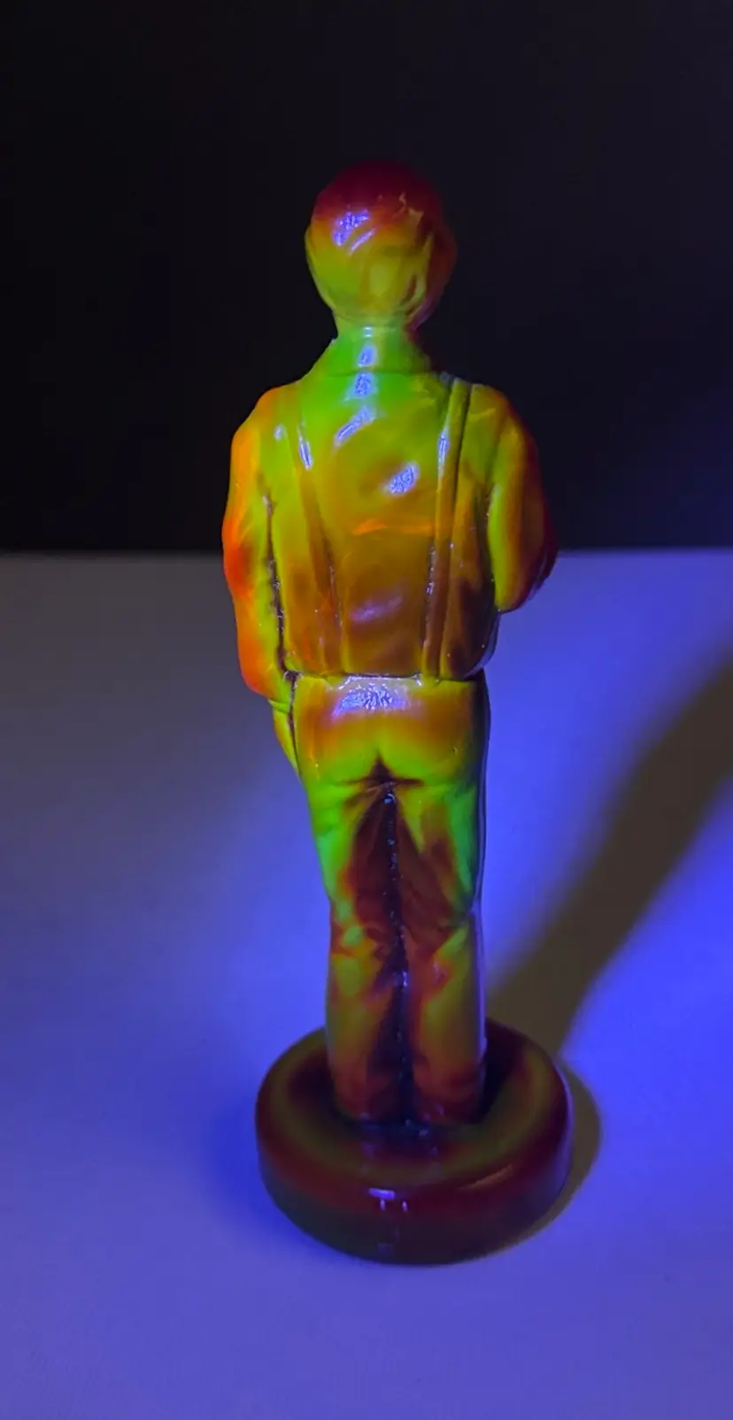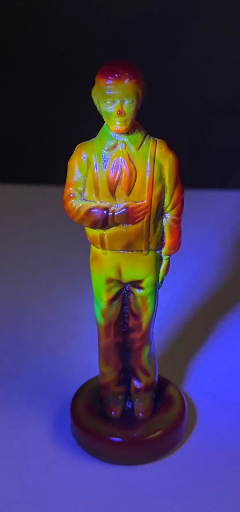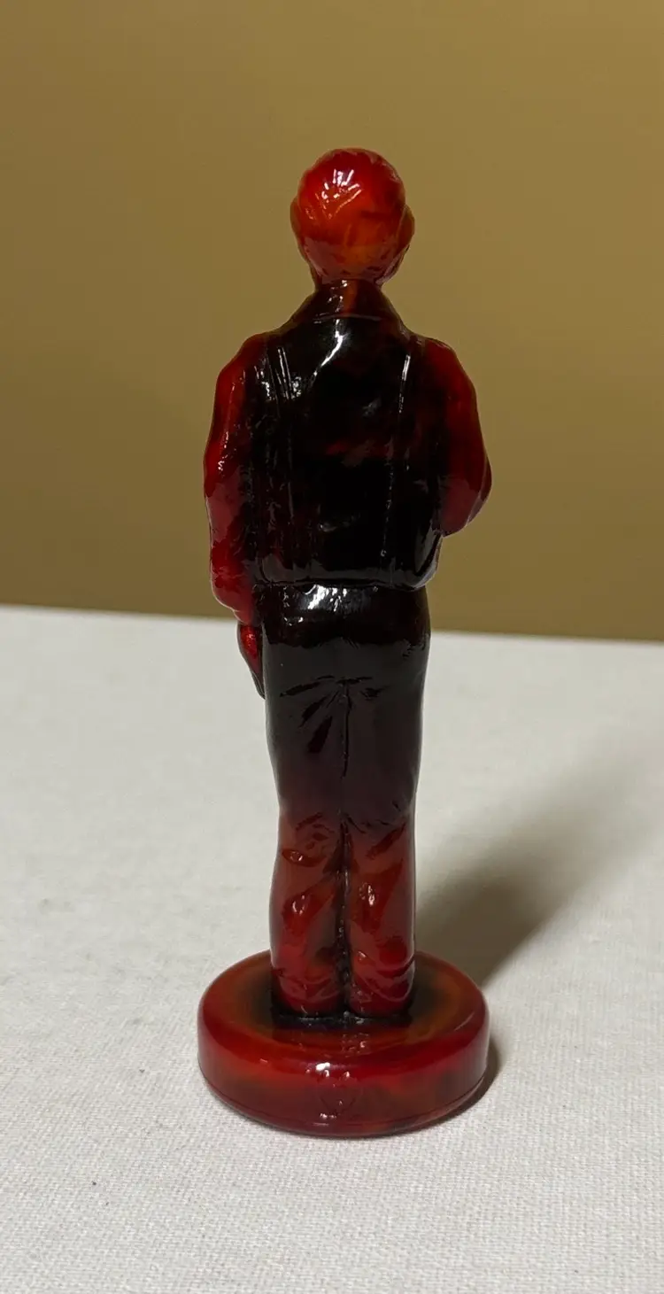 Degenhart Glass John Alden Ruby Red 5 1/4" Figurine with cadmium orange and uranium green glow under black light The figurine is called John Alden. He is about 1 3/4 inches wide by 5 1/4 inches tall. There are no chips or cracks. The figurine is marked with the Degenhart logo "D" inside a Heart with a line under it. This means this was made for the Degenhart Glass Museum gift shop and was made by Mosser Glass. This was only available at the Museum Gift Shop. These are hard to find as there were only a limited number of pieces made. This would make a great addition to your collection. Excellent condition with no breaks or chips (122411525nya)