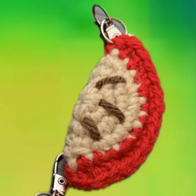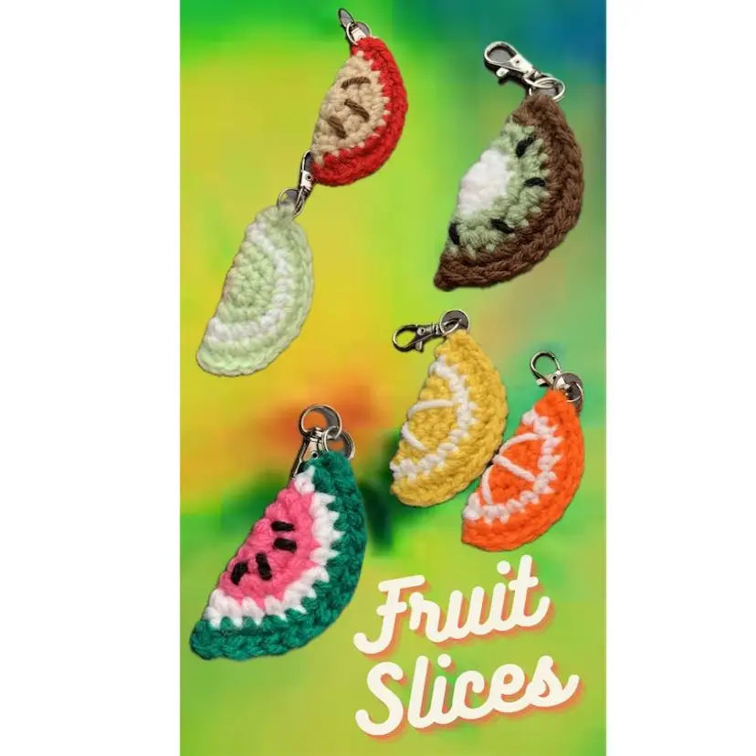 Super cute crocheted fruit slice keychains are about 2.5 inches by 1.5 inches and weigh about 1 ounce, making them a cute addition to your keychain without adding a bunch of extra bulk. If you have other fruit slice requests, reach out and I can see what I can do!