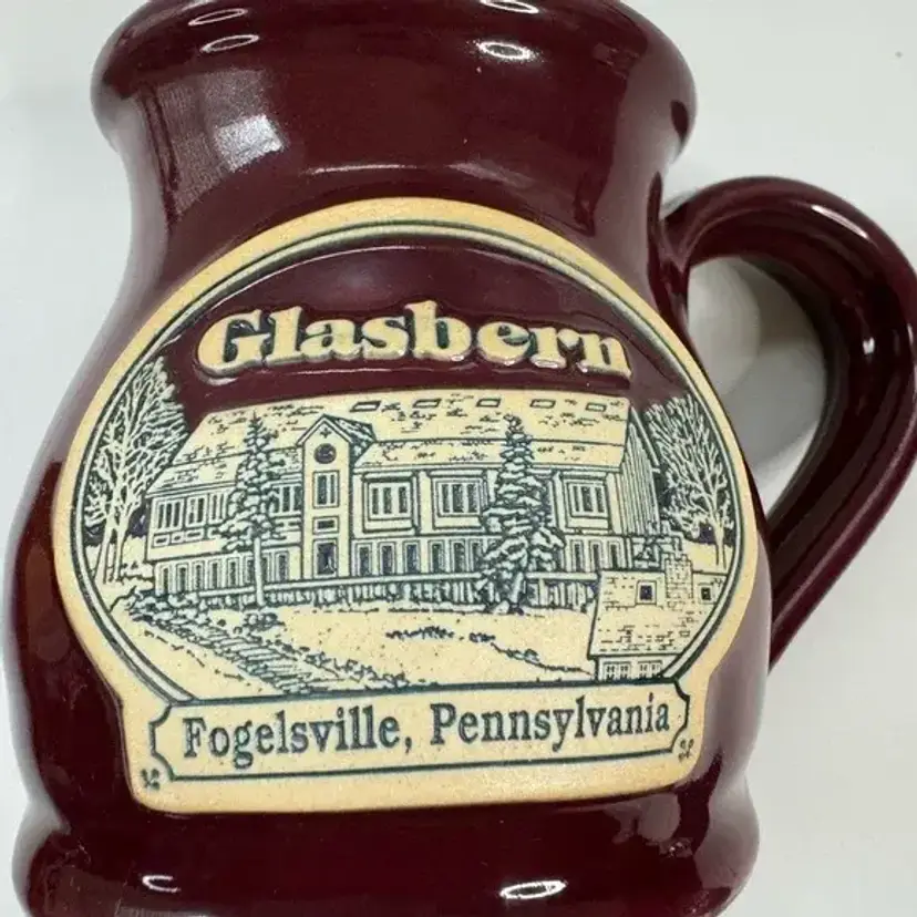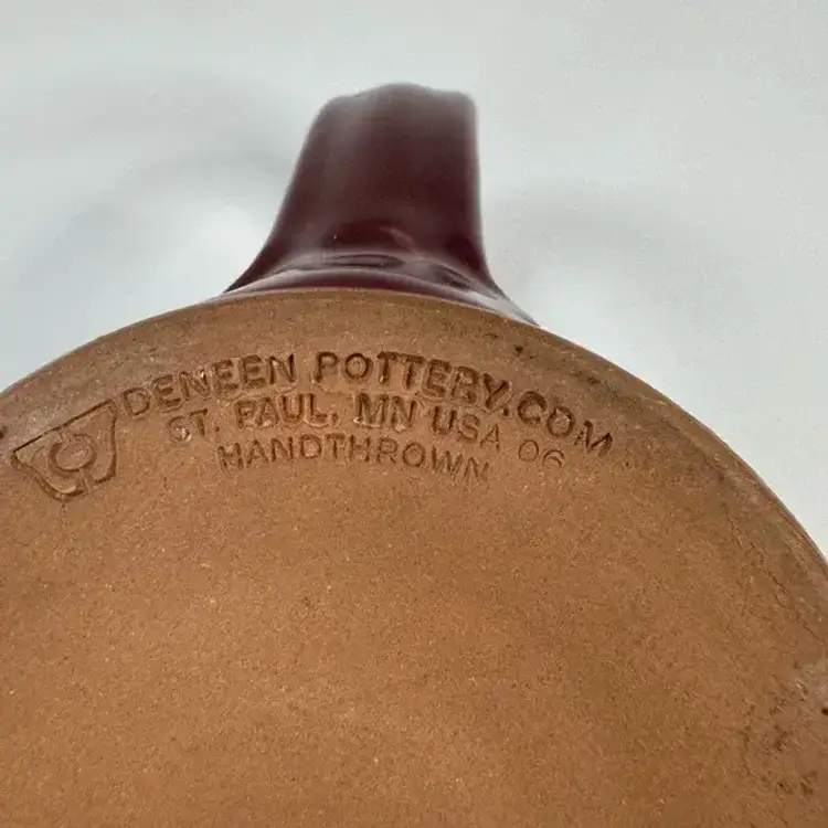 Deneen Pottery Hand Thrown mug. Glasbern Inn in Foglesville Pennsylvania. 3 3/4” tall 3" diameter and 5" wide to side of handle. Weighs 14.5 ounces. Very good condition.