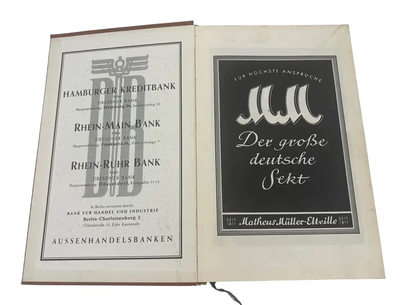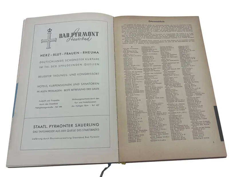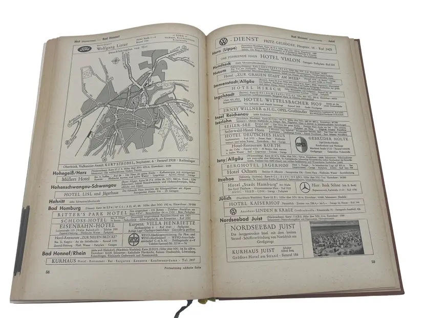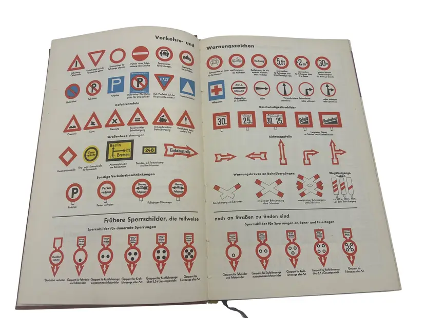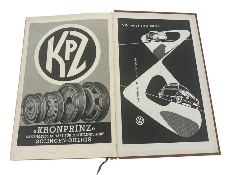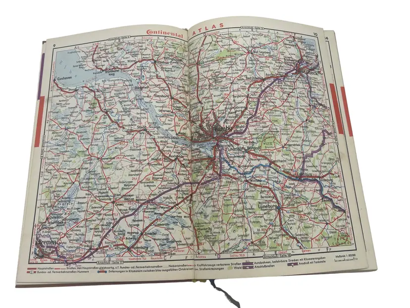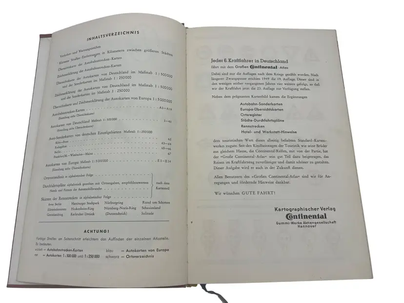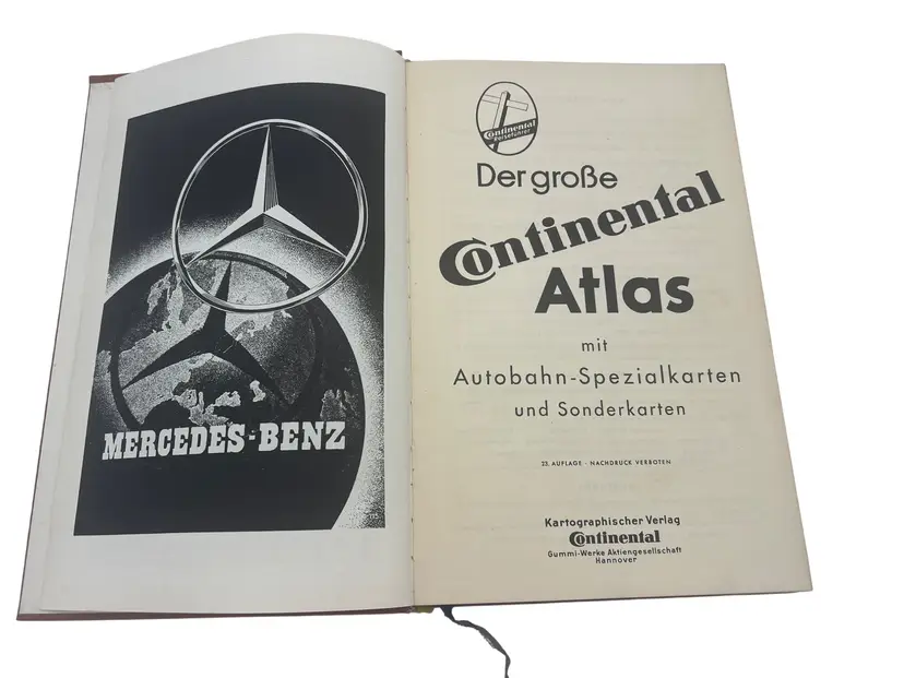 Hardcover German road atlas "Der Große" published by Continental (Hannover), 23rd Edition, early 1950s. Includes color road-sign charts, detailed road maps of Germany, Europe overview maps, city thru-maps, and an alphabetical place index. Excellent period advertising throughout (Mercedes-Benz, Volkswagen, Kronprinz, etc.). Approx. 10" x 6.25". A wonderful mid-century Autobahn atlas with great car-culture graphics.