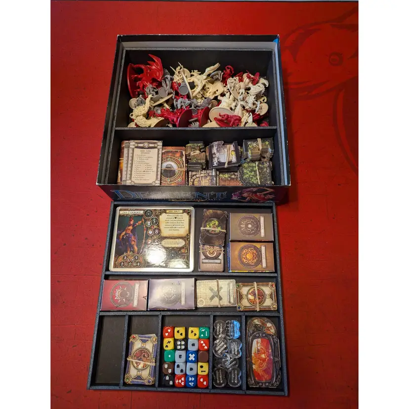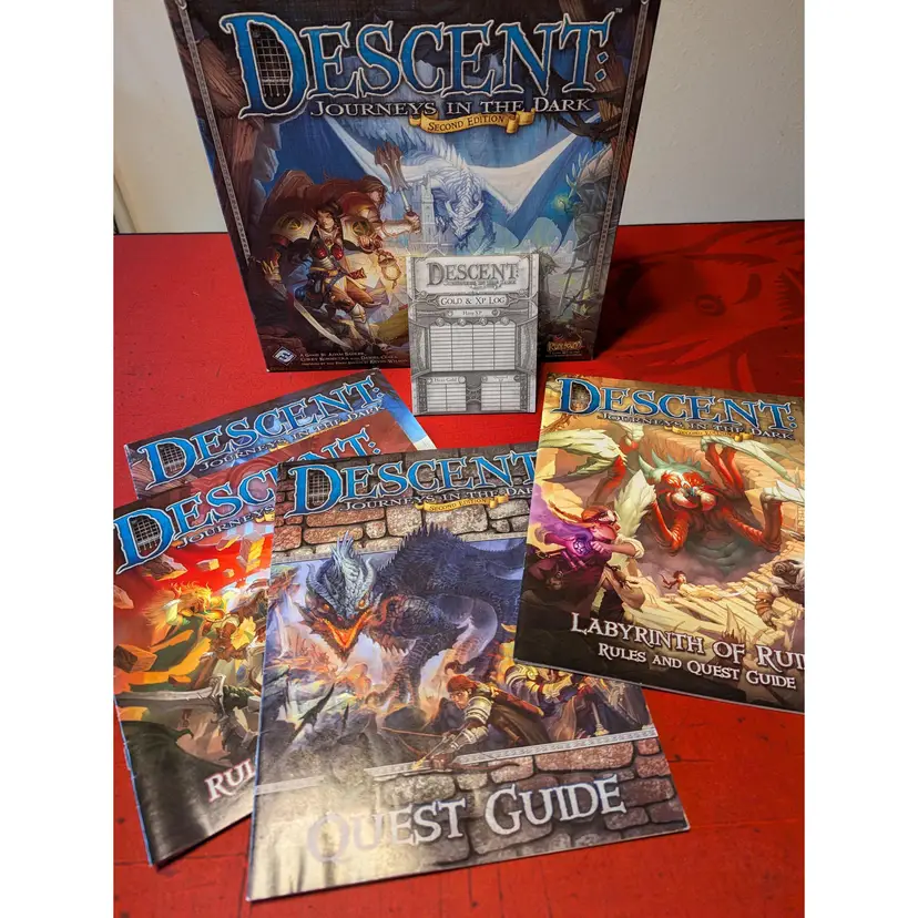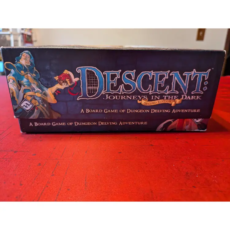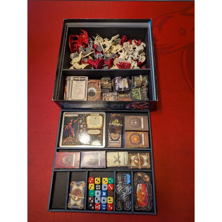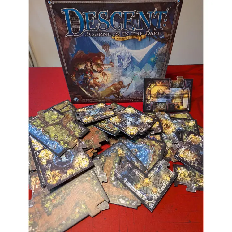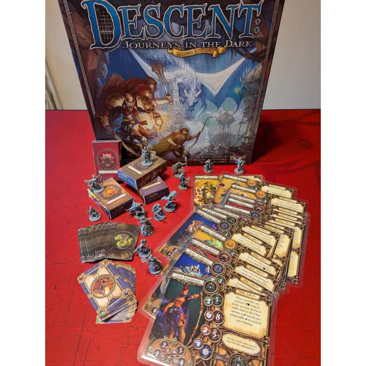 Very good condition - played several times. All components are present and in great shape. Contains Labyrinth of Ruin expansion and one extra dice set. We made some modifications: Hero cards are laminated - well protected and shiny, which you can see in the photo. Contains homemade tuck boxes for hero roles. Homemade foam core insert. All components fit in the box with a 1inch lid lift. Minor damage on one corner of the bottom of the box, which you can see in one of the photos. https://www.fantasyflightgames.com/en/products/descent-journeys-in-the-dark-second-edition/