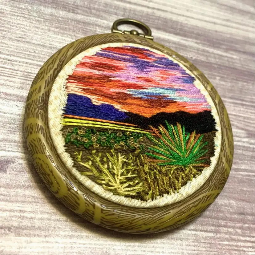 This mini embroidery depicts a colorful desert landscape, featuring a high-speed highway in the background. It is hand-stitched on printed cotton fabric.
