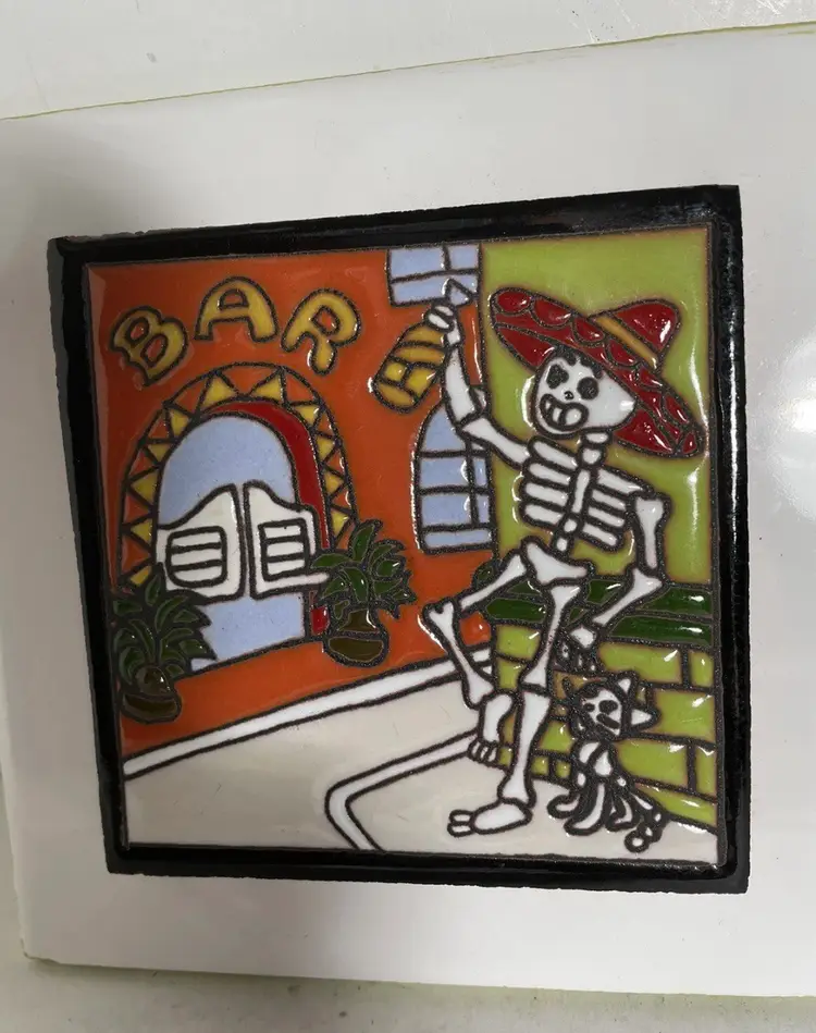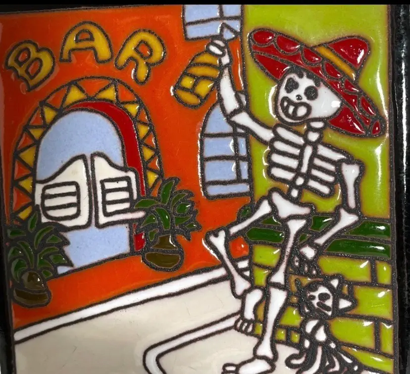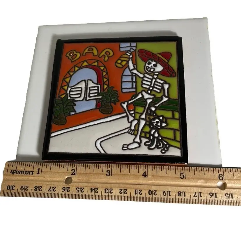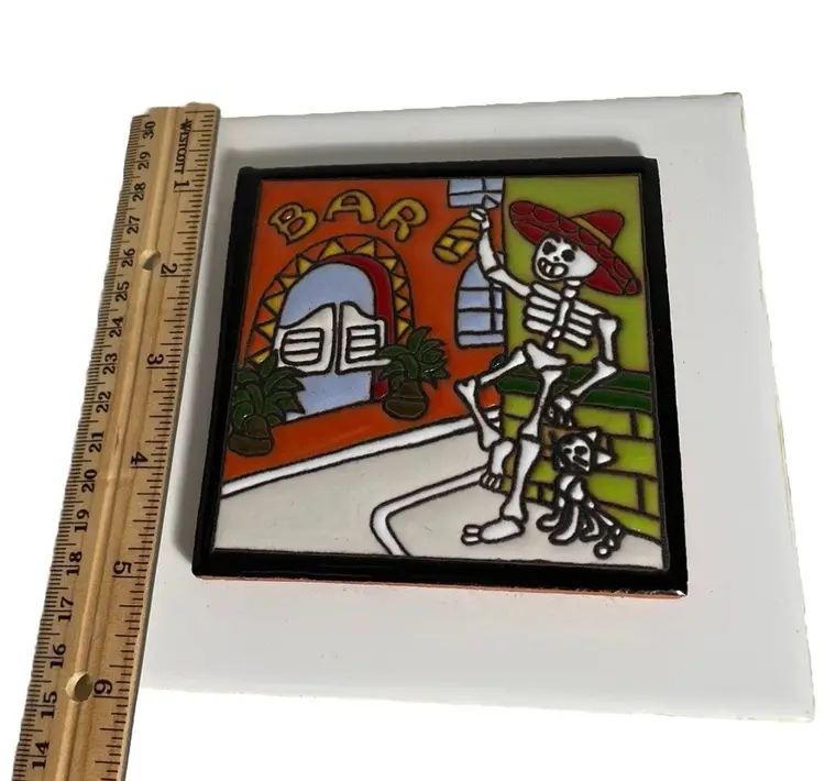 Hand painted. Abobe clay 4” tile mounted on ceramic 6” tile. Hook on back for hanging. No chips or cracks.