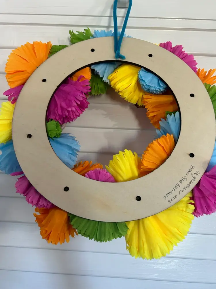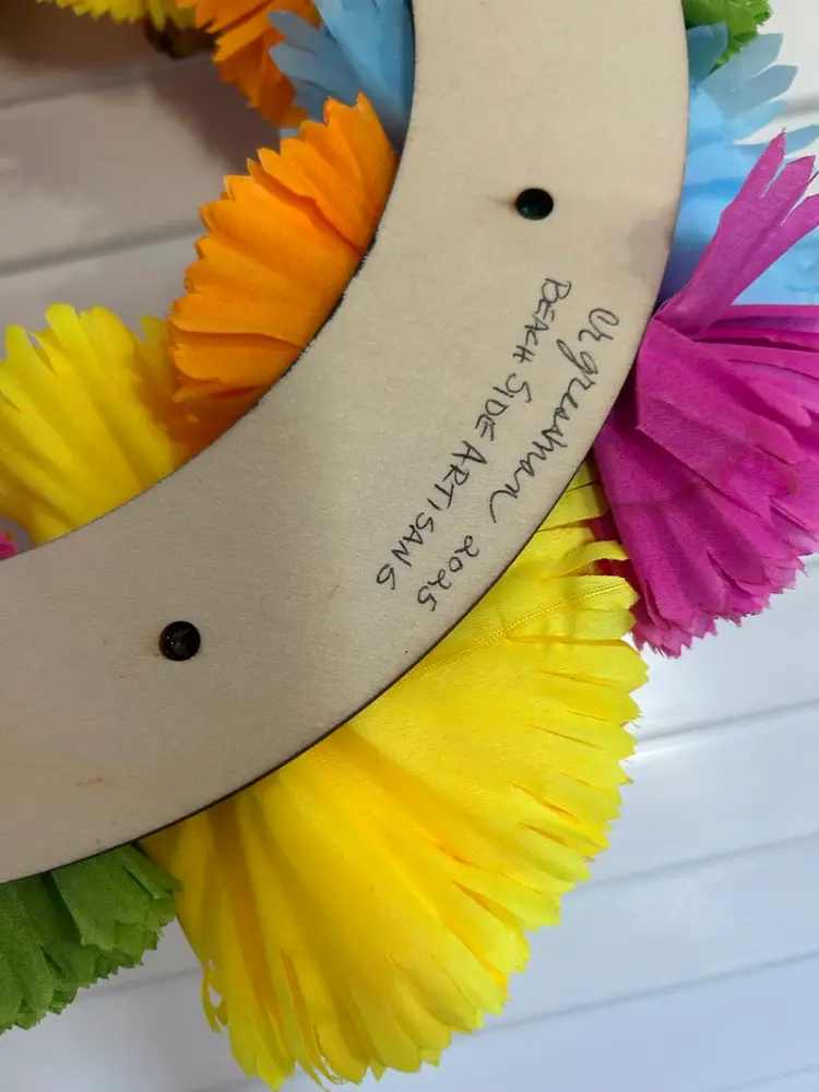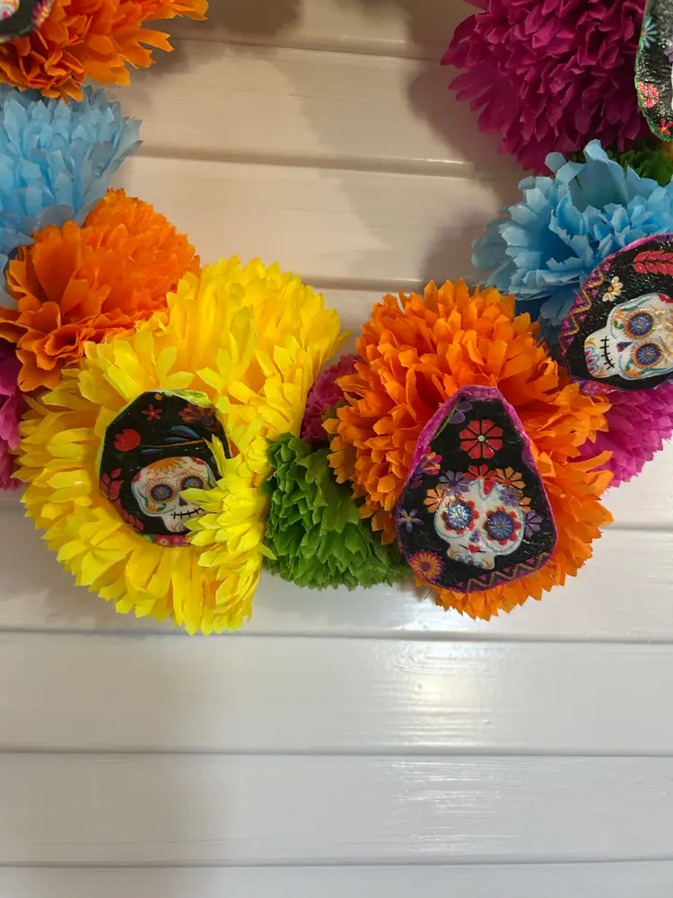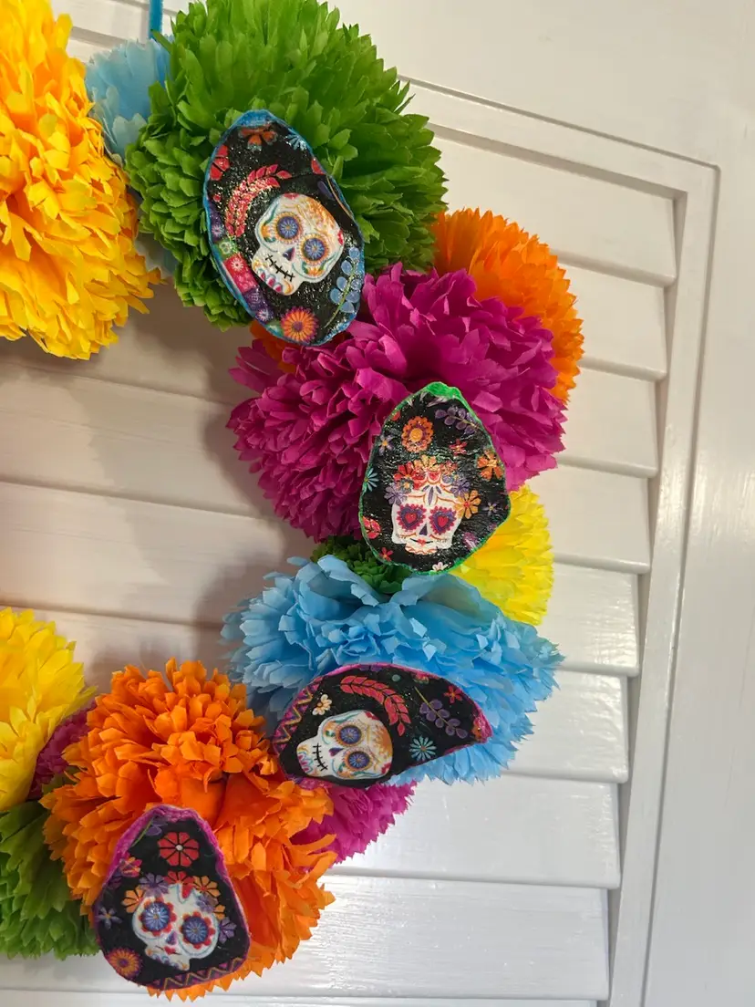 This Mexican holiday is such a great joyous tradition. It is celebrated November 1 and 2. November 1 is dedicated to the children who have passed and the 2nd is for the adults. I took the flowers and attached them to the wooden wreath. I took oyster shells and decoupaged the sugar skulls and using E6000 glue attached them to the flowers. It measures approximately 15” in diameter