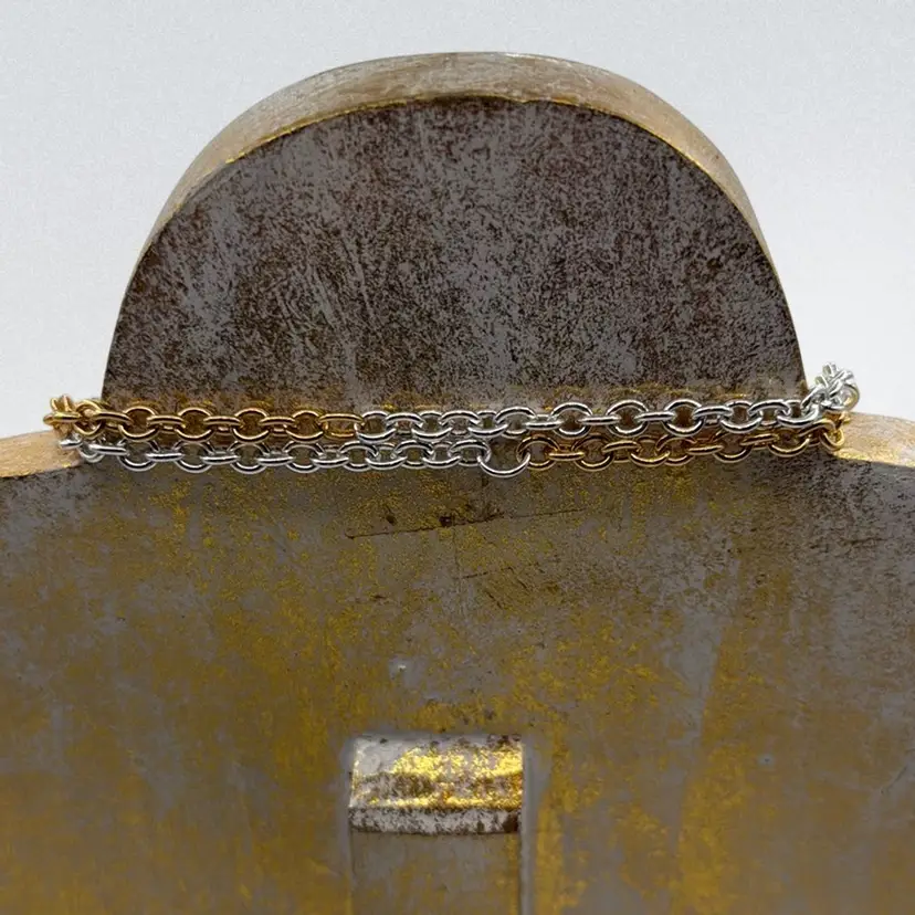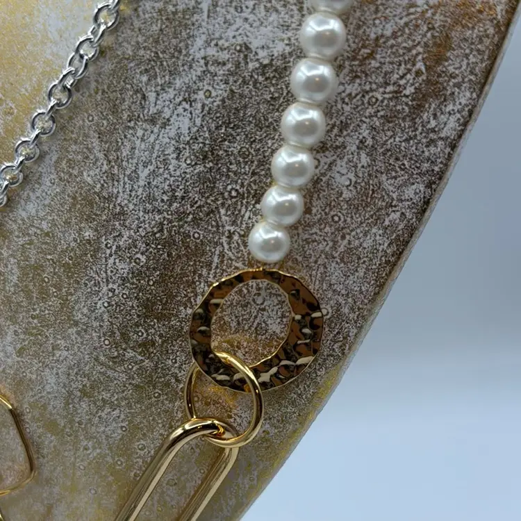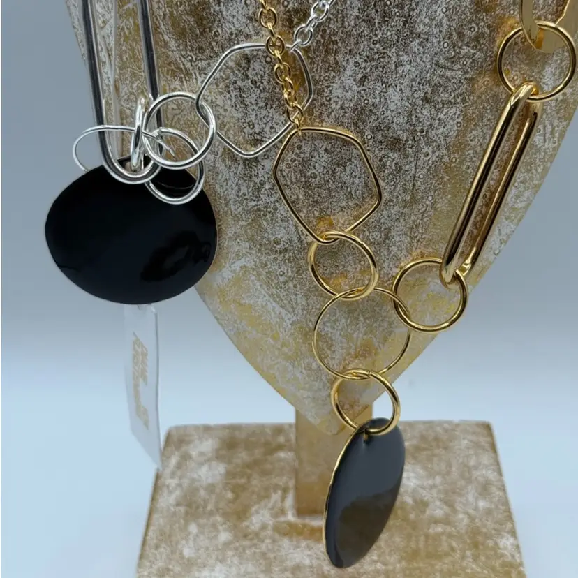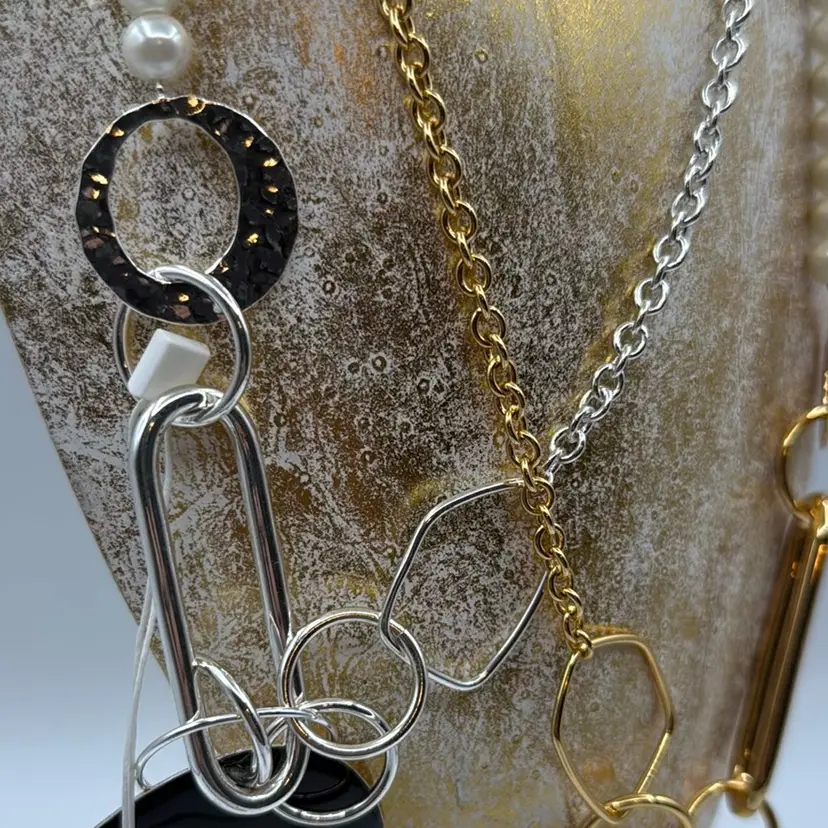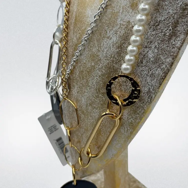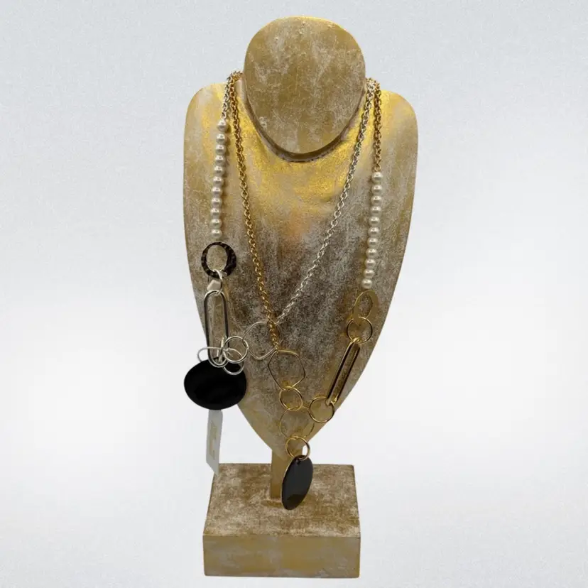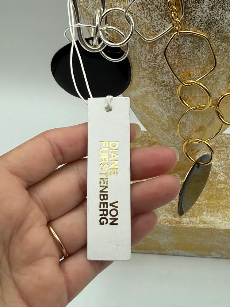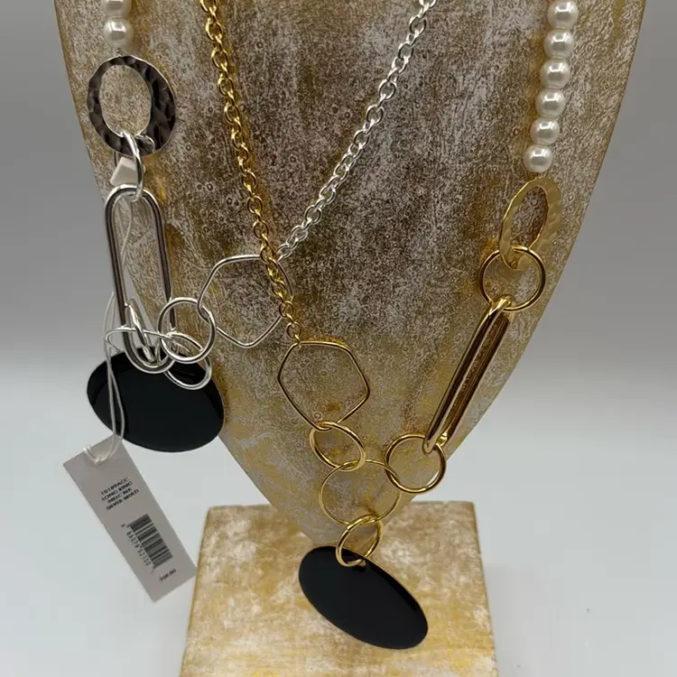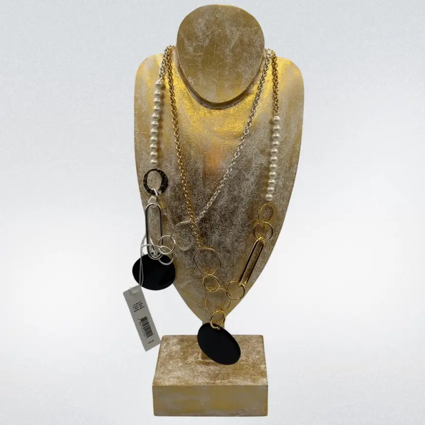 This necklace is a juxtaposition of various chain link styles, including mixed metals of silvertone, goldtone, and faux pearl strands. It features chunky links in silver and gold, with a black round enamel discs at the bottom. Item is new unused with original hangtag. This is a bold, fashion-forward piece, typical of the designer's style, which often incorporates mixed metals and statement elements. Perfect for all seasons, it would look fabulous with the designers iconic wrap dresses. Necklace measures 50” in length and looks fabulous doubled up which enhances the contrasting nature of the design. Orig. Retail $268.
