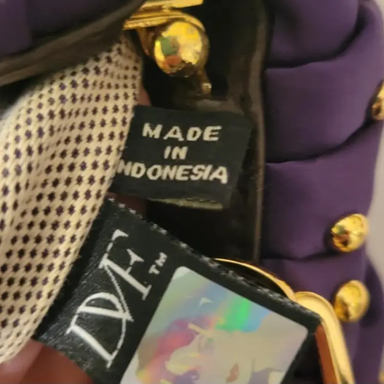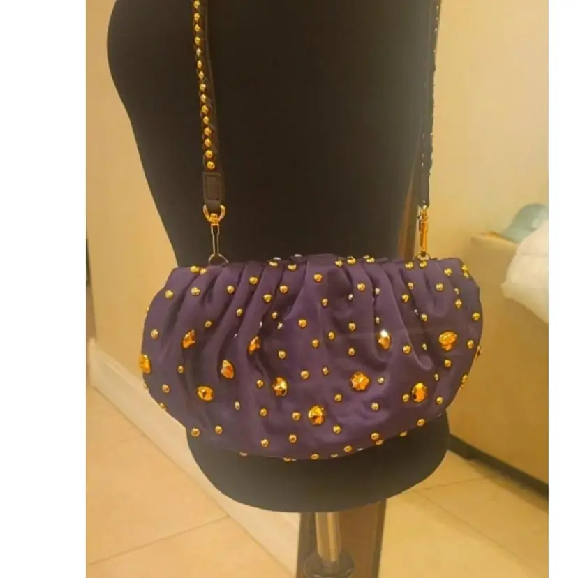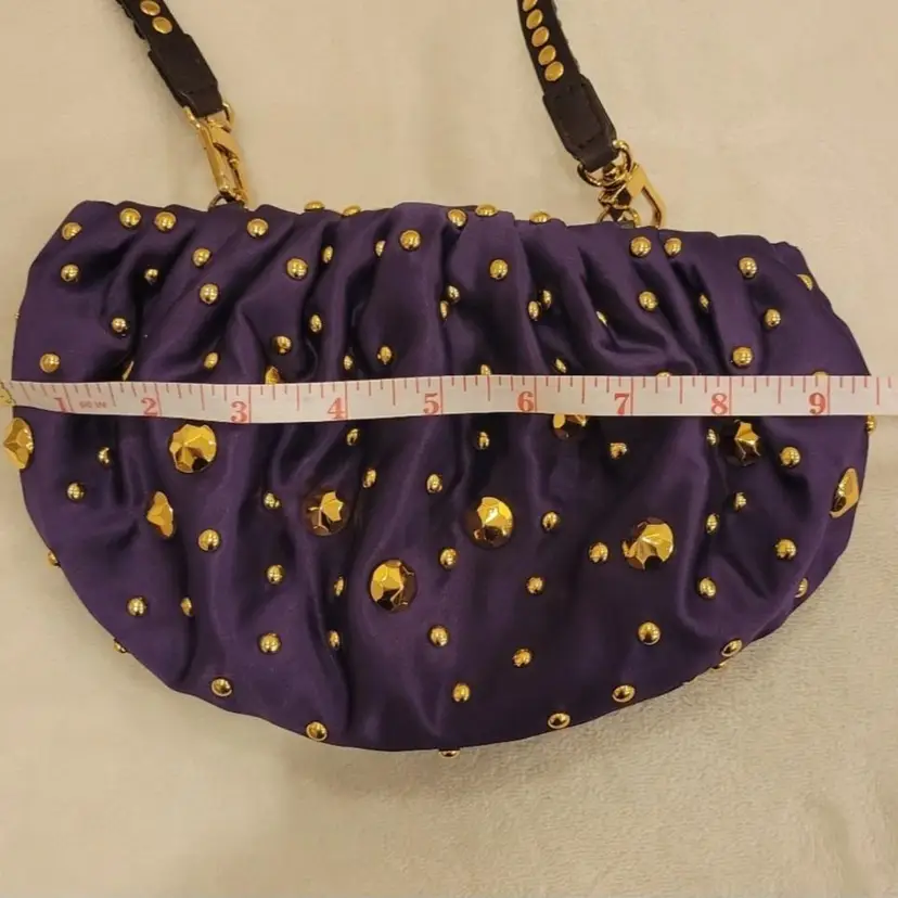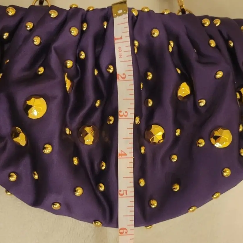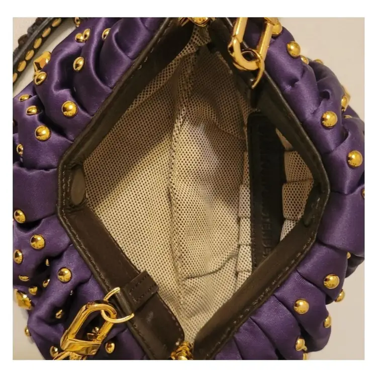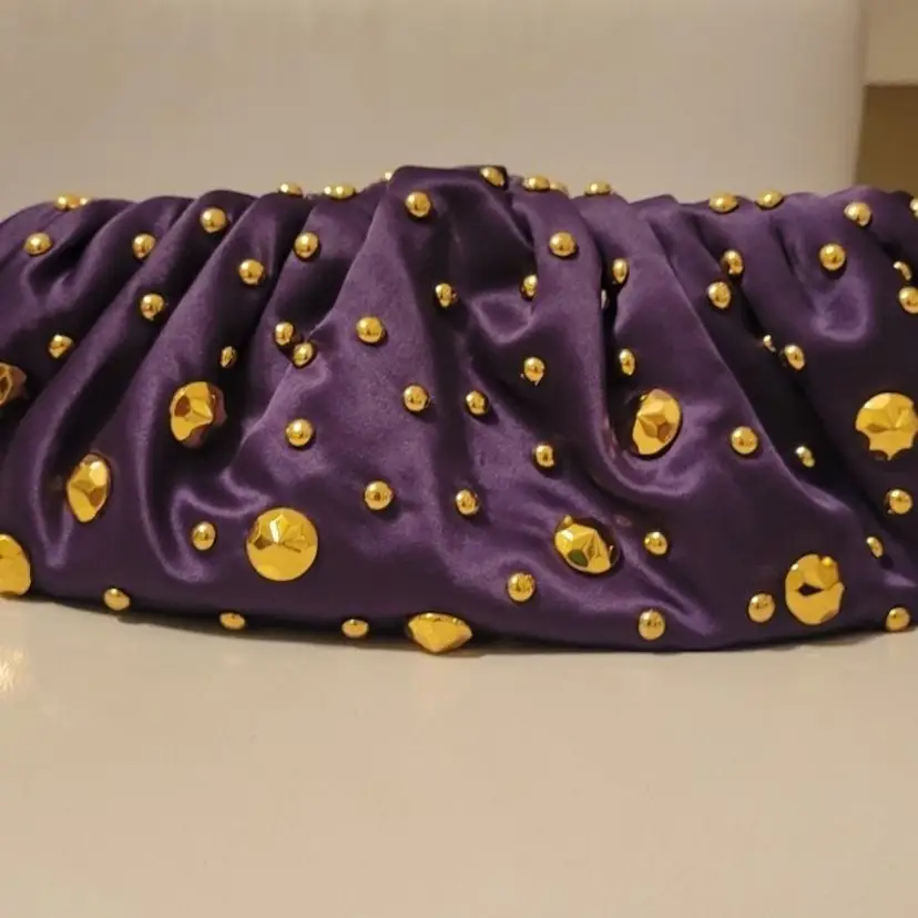 Vintage Diane von Fusternberg Purple Satin Pouch Evening Bag with gold studs on all sides. This is a vintage 1980's bag that was never worn and kept in perfect condition. Signature hologram on the inside seam. See pictures for measurements