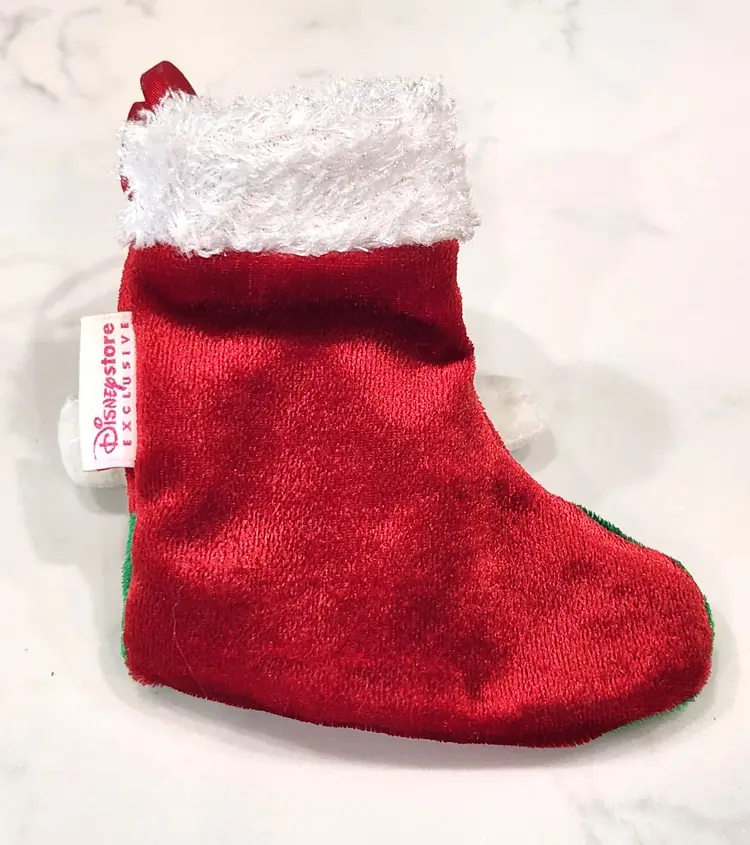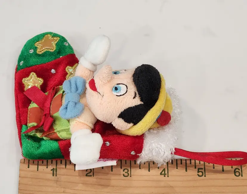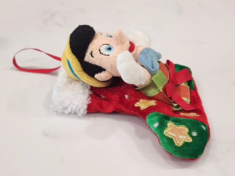 Adorable 3D Pinocchio coming out of a gift box on a velvet stocking. From the Disney Store. Measures 4" x 4". Very nice condition. Stocking is velvet with appliqued stars.